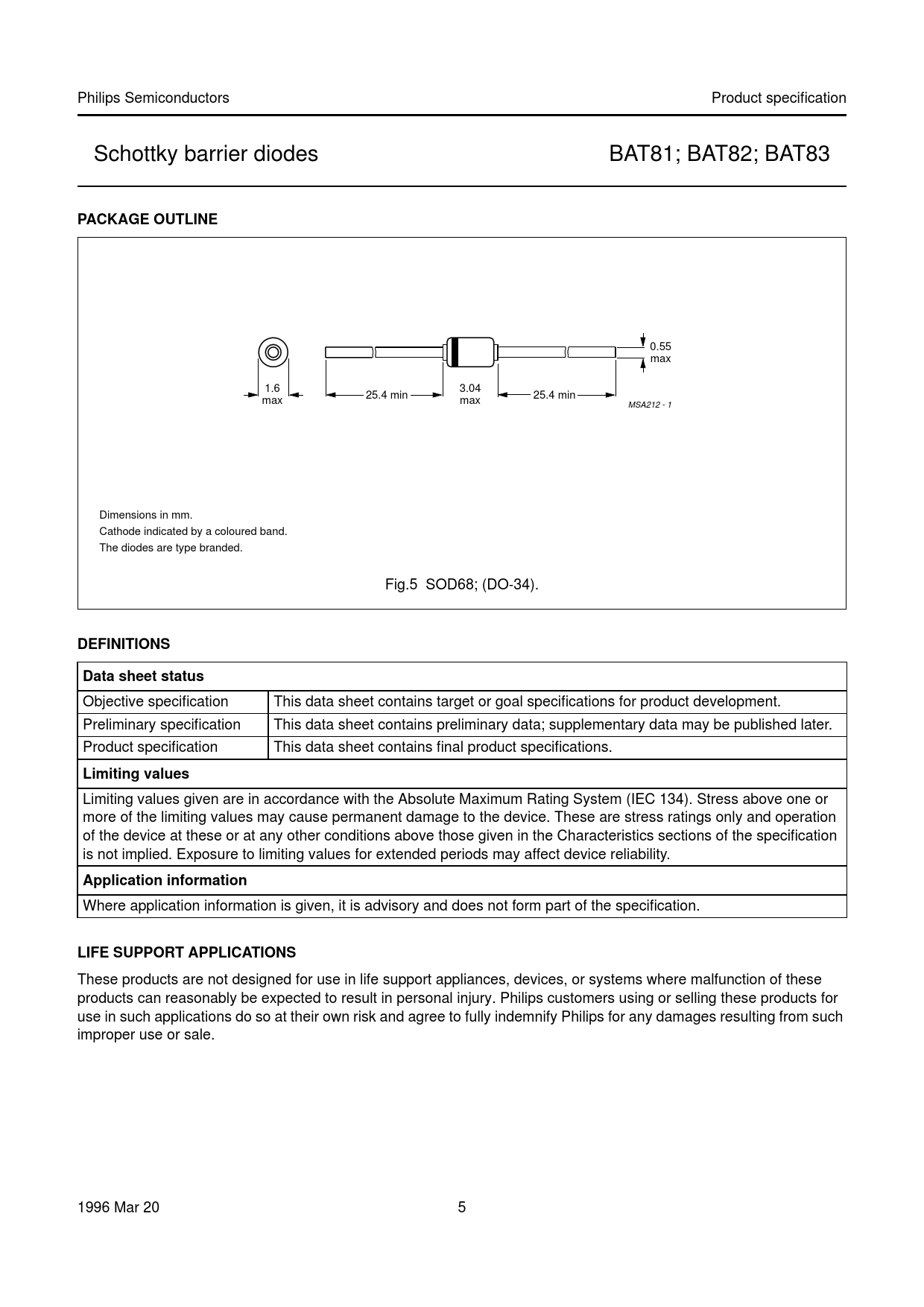 Philips Semiconductors Product specification Schottky barrier diodes BAT81; BAT82; BAT83 PACKAGE OUTLINE handbook, full pagewidth 0.55 max 1.6 3.04 25.4 min 25.4 min max max MSA212 - 1 Dimensions in mm. Cathode indicated by a coloured band. The diodes are type branded. Fig.5 SOD68; (DO-34). DEFINITIONSData sheet status Objective specification This data sheet contains target or goal specifications for product development. Preliminary specification This data sheet contains preliminary data; supplementary data may be published later. Product specification This data sheet contains final product specifications. Limiting values Limiting values given are in accordance with the Absolute Maximum Rating System (IEC 134). Stress above one or more of the limiting values may cause permanent damage to the device. These are stress ratings only and operation of the device at these or at any other conditions above those given in the Characteristics sections of the specification is not implied. Exposure to limiting values for extended periods may affect device reliability. Application information Where application information is given, it is advisory and does not form part of the specification. LIFE SUPPORT APPLICATIONS These products are not designed for use in life support appliances, devices, or systems where malfunction of these products can reasonably be expected to result in personal injury. Philips customers using or selling these products for use in such applications do so at their own risk and agree to fully indemnify Philips for any damages resulting from such improper use or sale. 1996 Mar 20 5