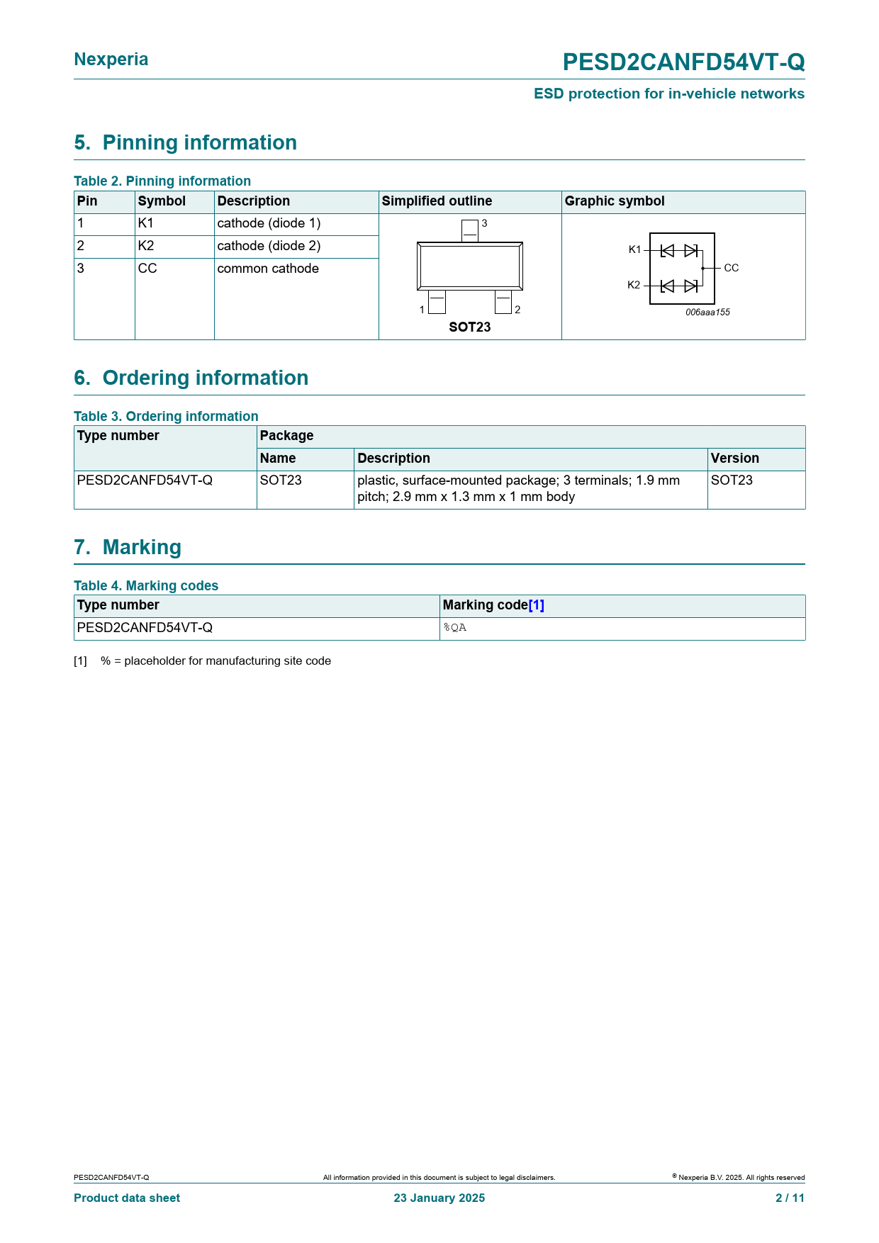 PESD2CANFD54VT-Q %QA [1] % = placeholder for manufacturing site code PESD2CANFD54VT-Q All information provided in this document is subject to legal disclaimers. © Nexperia B.V. 2025. Al rights reserved