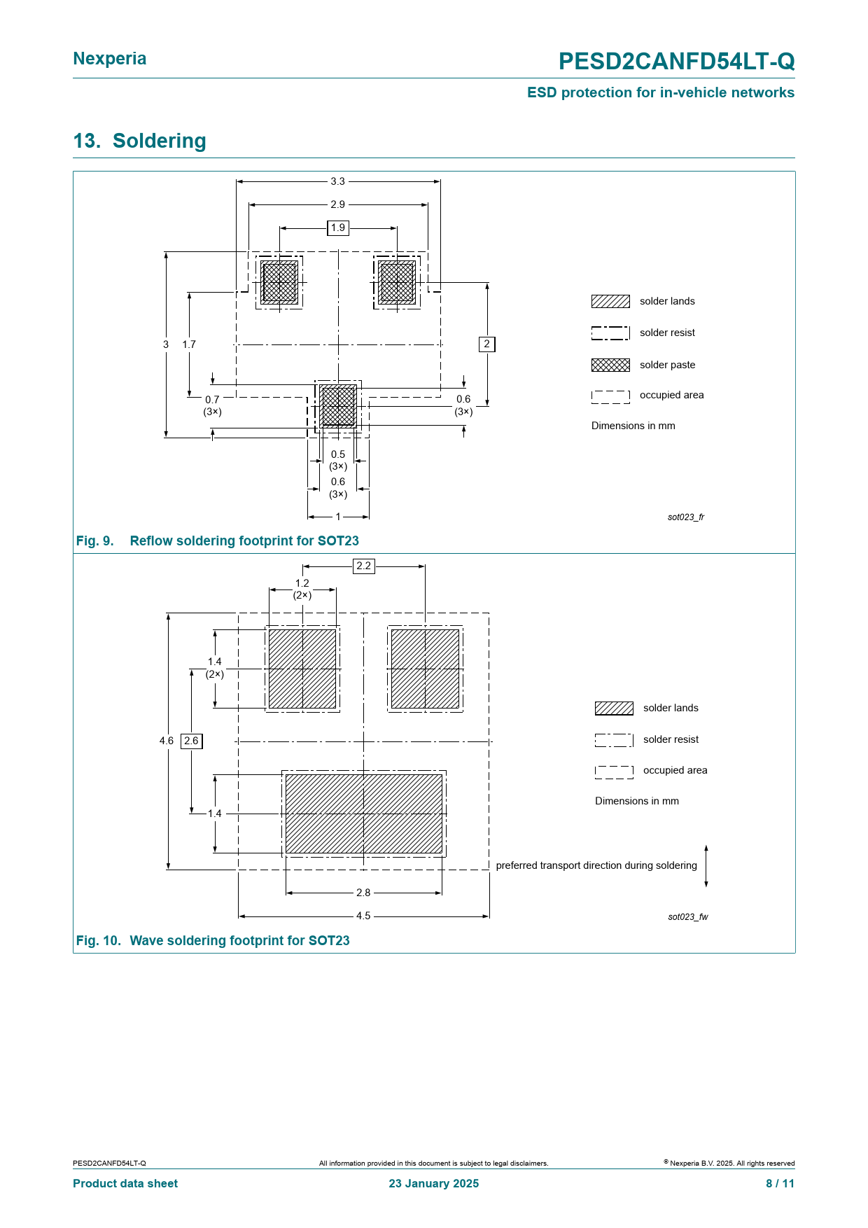 Nexperia. PESD2CANFD54LT-Q. ESD protection for in-vehicle networks. 13. Soldering. Fig. 9. Reflow soldering footprint for SOT23