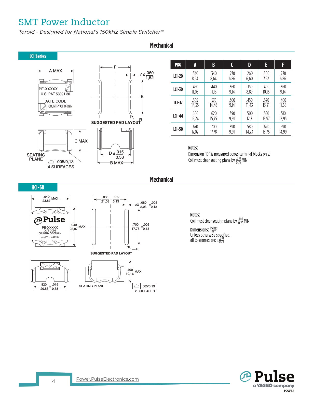 .Inches mm Unless otherwise specified, all tolerances are: ±..010 0,25 4 Power.PulseElectronics.com