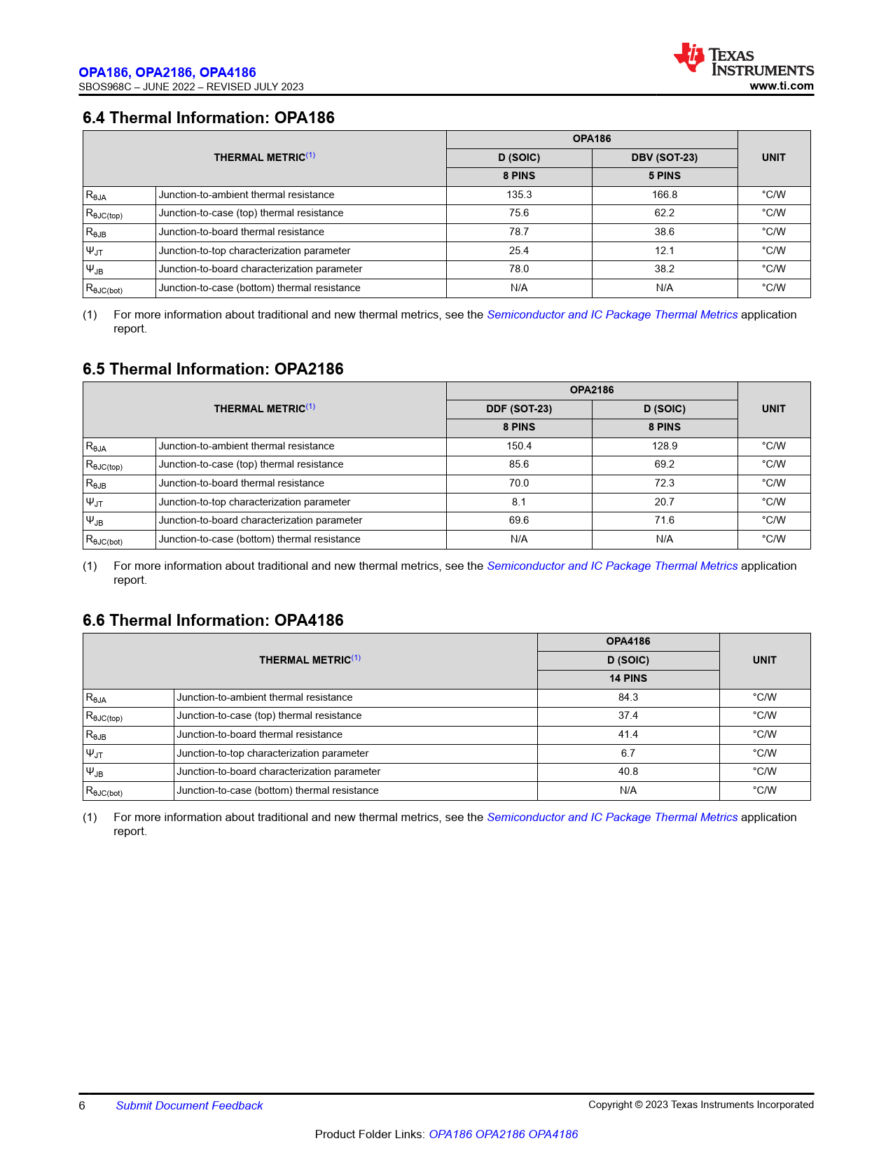 OPA186, OP. A2186, OP. A4186. www.ti.com. 6.4 Thermal Information: OPA186. OPA186. THERMAL METRIC. D (SOIC). DBV (SOT-23). UNIT. 8 PINS