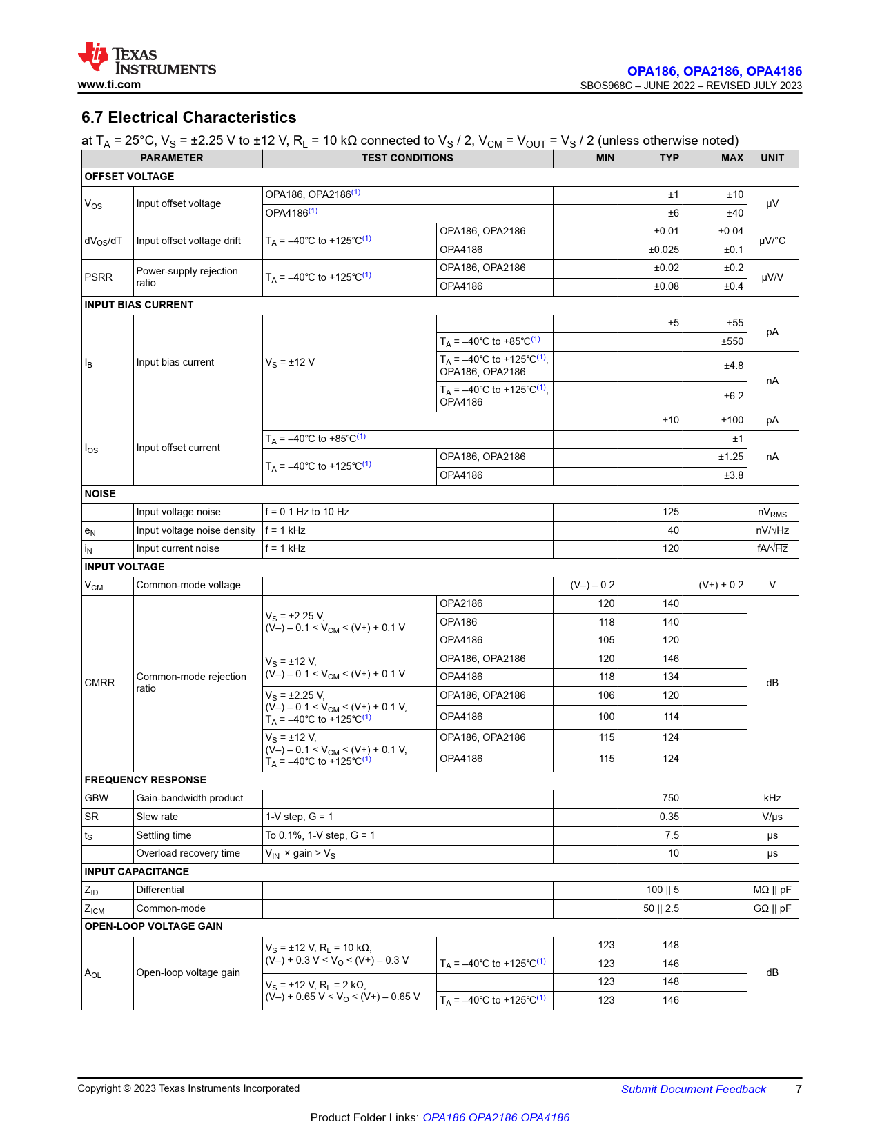 | 页数 / 页 | 49 / 7 — OPA186. , OPA2186. , OPA4186. www.ti.com. 6.7 Electrical Characteristics. … |