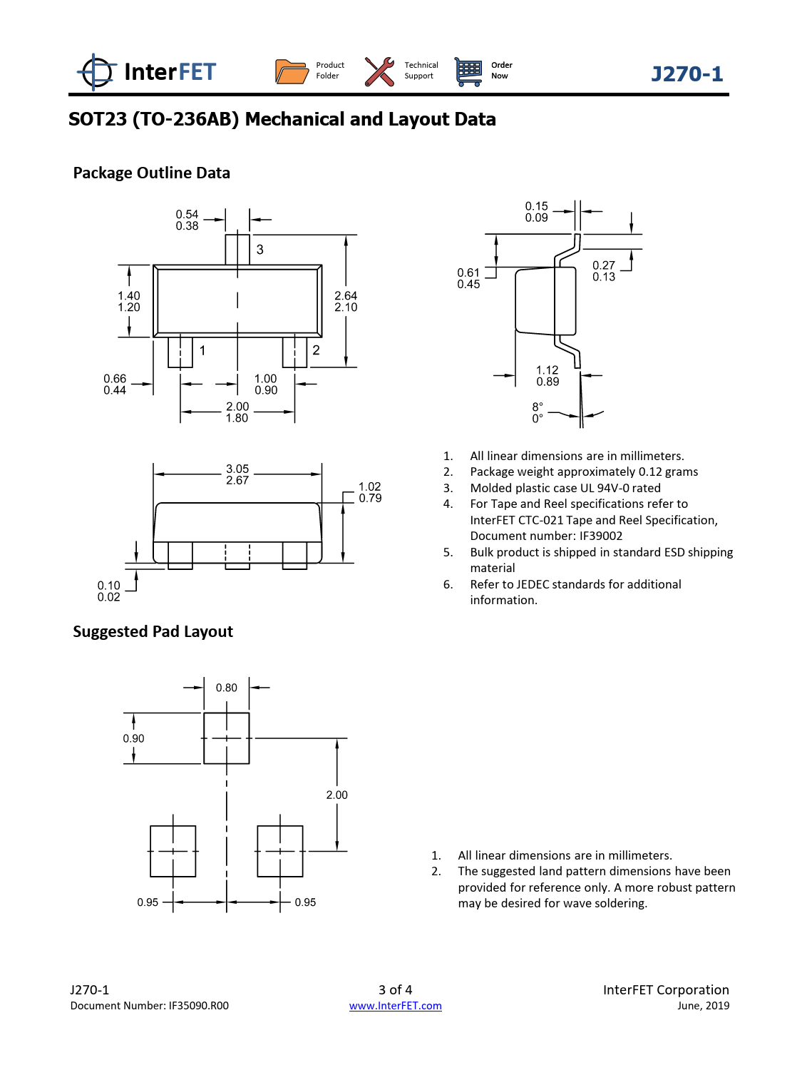 1. All linear dimensions are in millimeters. 2. The suggested land pattern dimensions have been provided for reference only. A more robust pattern may be desired for wave soldering. J270-1 3 of 4 InterFET Corporation Document Number: IF35090.R00 www.InterFET.com June, 2019