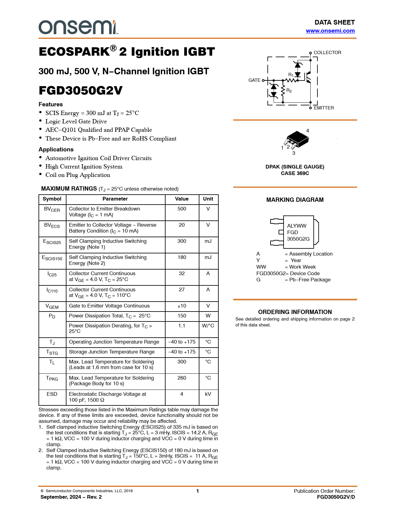 link to page 1 link to page 1 link to page 2 DATA SHEETwww.onsemi.com ECOSPARK 2 Ignition IGBT COLLECTOR 300 mJ, 500 V, N−Channel Ignition IGBT R1 GATE FGD3050G2V R2 Features EMITTER SCIS Energy = 300 mJ at TJ = 25C Logic Level Gate Drive AEC−Q101 Qualified and PPAP Capable 4 These Device is Pb−Free and are RoHS Compliant Applications 1 2 3 Automotive Ignition Coil Driver Circuits High Current Ignition System DPAK (SINGLE GAUGE) Coil on Plug Application CASE 369CMAXIMUM RATINGS (TJ = 25C unless otherwise noted) SymbolParameterValueUnitMARKING DIAGRAM BVCER Collector to Emitter Breakdown 500 V Voltage (IC = 1 mA) BVECS Emitter to Collector Voltage − Reverse 20 V ALYWW Battery Condition (IC = 10 mA) FGD E 3050G2G SCIS25 Self Clamping Inductive Switching 300 mJ Energy (Note 1) A = Assembly Location ESCIS150 Self Clamping Inductive Switching 180 mJ Energy (Note 2) Y = Year WW = Work Week IC25 Collector Current Continuous 32 A FGD3050G2= Device Code at VGE = 4.0 V, TC = 25C G = Pb−Free Package IC110 Collector Current Continuous 27 A at VGE = 4.0 V, TC = 110C VGEM Gate to Emitter Voltage Continuous 10 V ORDERING INFORMATION PD Power Dissipation Total, TC = 25C 150 W See detailed ordering and shipping information on page 2 Power Dissipation Derating, for TC > 1.1 W/C of this data sheet. 25C TJ Operating Junction Temperature Range −40 to +175 C TSTG Storage Junction Temperature Range −40 to +175 C TL Max. Lead Temperature for Soldering 300 C (Leads at 1.6 mm from case for 10 s) TPKG Max. Lead Temperature for Soldering 260 C (Package Body for 10 s) ESD Electrostatic Discharge Voltage at 4 kV 100 pF, 1500 Stresses exceeding those listed in the Maximum Ratings table may damage the device. If any of these limits are exceeded, device functionality should not be assumed, damage may occur and reliability may be affected. 1. Self clamped inductive Switching Energy (ESCIS25) of 335 mJ is based on the test conditions that is starting TJ = 25C, L = 3 mHy, ISCIS = 14.2 A, RGE = 1 k VCC = 100 V during inductor charging and VCC = 0 V during time in clamp. 2. Self Clamped inductive Switching Energy (ESCIS150) of 180 mJ is based on the test conditions that is starting TJ = 150C, L = 3mHy, ISCIS = 11 A, RGE = 1 k VCC = 100 V during inductor charging and VCC = 0 V during time in clamp. Semiconductor Components Industries, LLC, 2019 1 Publication Order Number: September, 2024 − Rev. 2FGD3050G2V/D