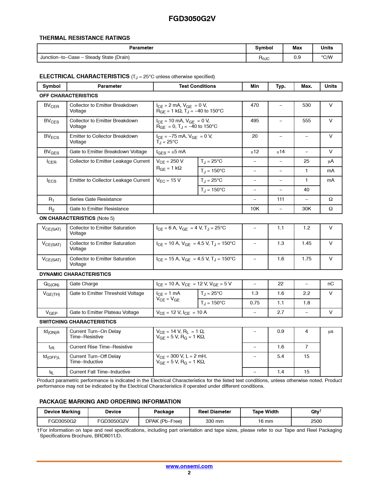 FGD3050G2V. THERMAL RESISTANCE RATINGS. Parameter. Symbol. Max. Units. ELECTRICAL CHARACTERISTICS. Test Conditions. Min. Typ. Max
