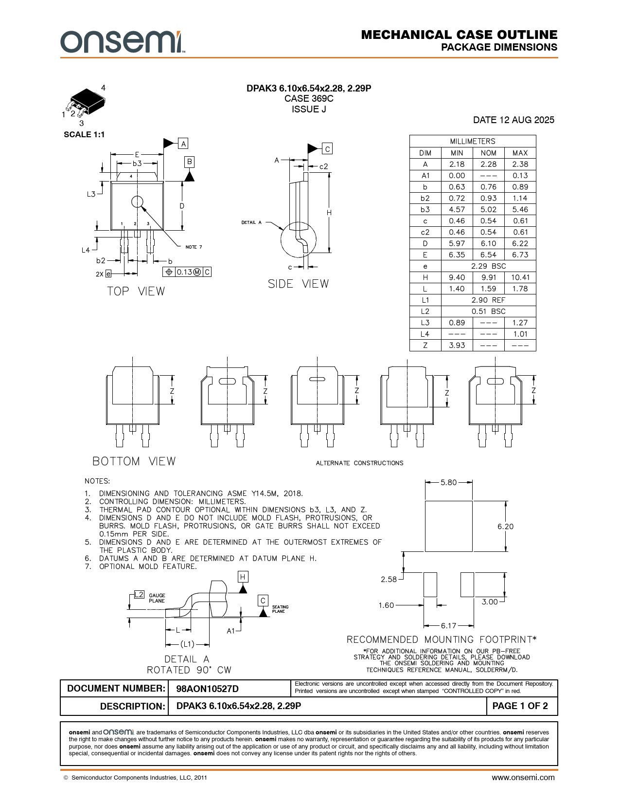 PACKAGE DIMENSIONS. DPAK3 6.10x6.54x2.28, 2.29P. SCALE 1:1. DOCUMENT NUMBER: 98AON10527D. DESCRIPTION:. PAGE 1 OF 2. onsemi