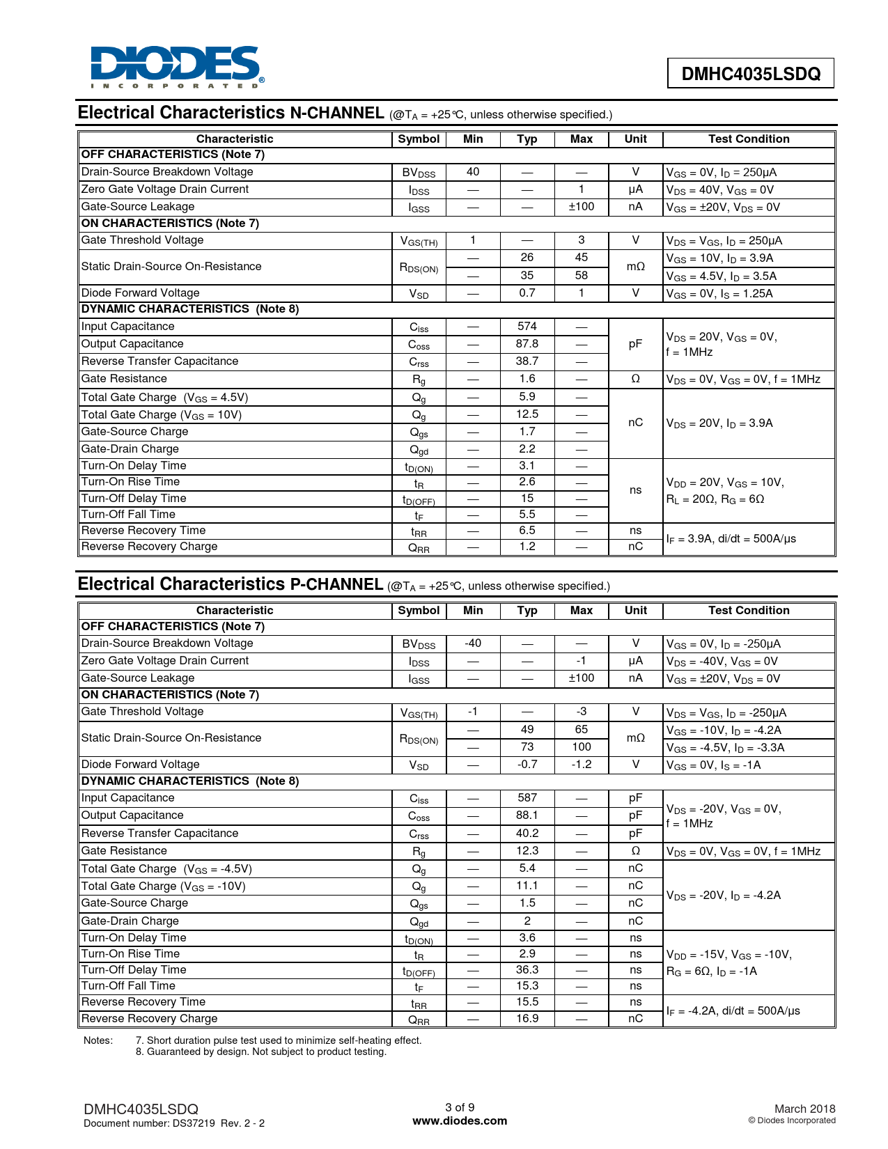 DMHC4035LSDQ. Electrical Characteristics N-CHANNEL. Characteristic. Symbol. Min. Typ. Max. Unit. Test Condition