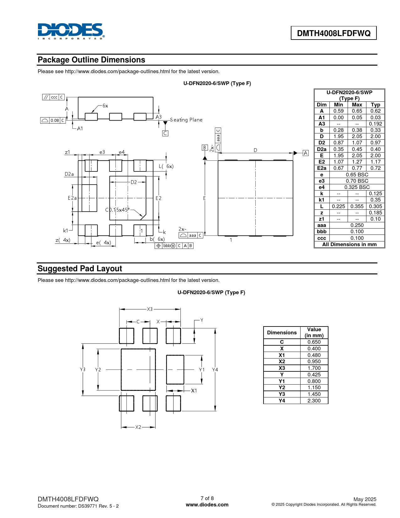 | 页数 / 页 | 8 / 7 — DMTH4008LFDFWQ. Package Outline Dimensions. U-DFN2020-6/SWP (Type F). … |