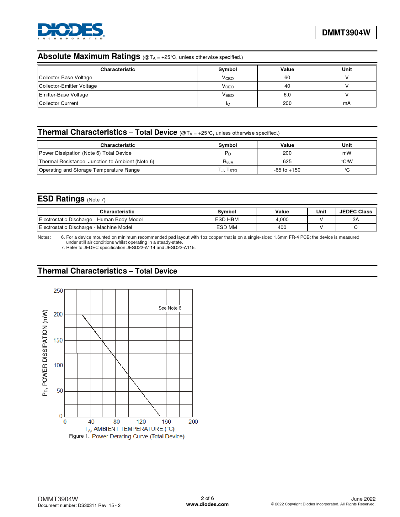) See Note 6 W (m N IO T A IP S IS D R E W O , PD P Figure 1. DMMT3904W 2 of 6 June 2022 Document number: DS30311 Rev. 15 - 2