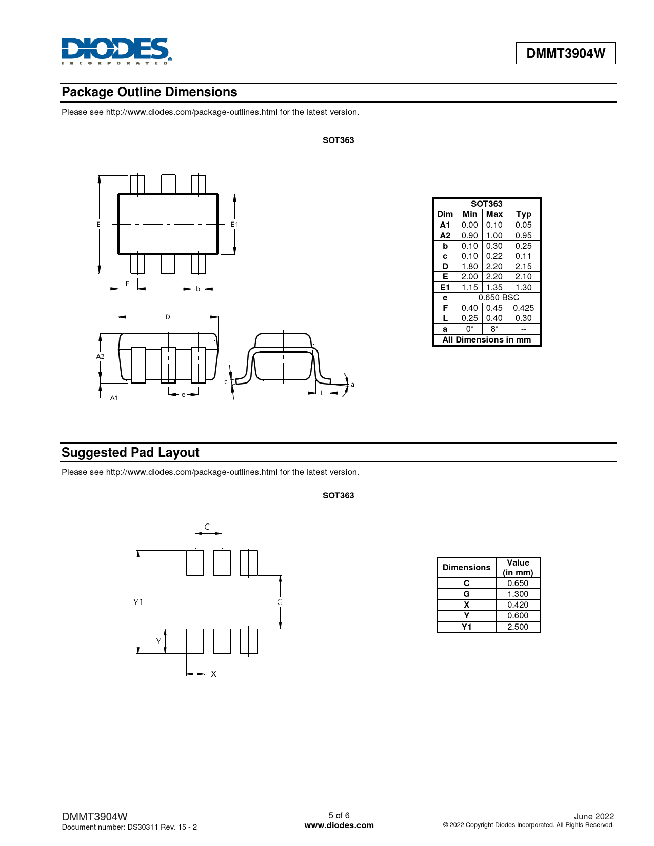 DMMT3904W. Package Outline Dimensions. SOT363. Dim Min Max. Typ. All Dimensions in mm. Suggested Pad Layout. Value. Dimensions. (in mm)