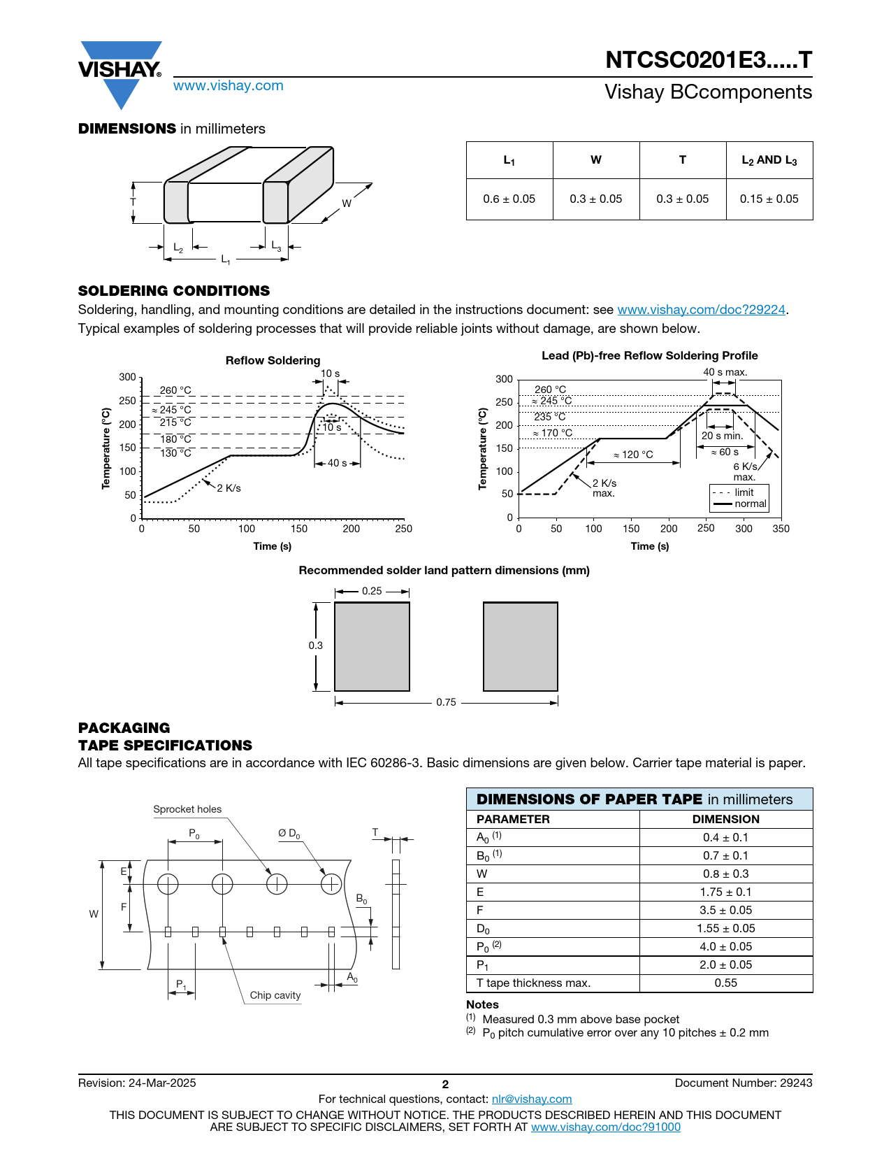 NTCSC0201E3...T www.vishay.com Vishay BCcomponents DIMENSIONS in millimeters L1WTL2 AND L3 T W 0.6 ± 0.05 0.3 ± 0.05 0.3 ± 0.05 0.15 ± 0.05 L L 2 3 L1 SOLDERING CONDITIONS Soldering, handling, and mounting conditions are detailed in the instructions document: see www.vishay.com/doc?29224. Typical examples of soldering processes that will provide reliable joints without damage, are shown below. Reflow SolderingLead (Pb)-free Reflow Soldering Profile 300 10 s 40 s max. 300 260 °C 260 °C 250 250 | 245 °C |245 °C 235 °C 200 215 °C 200 e (°C) 10 s 180 °C |170 °C 20 s min. 150 130 °C 150 |120 °C |60 s 40 s 100 6 K/s mperatur 100 eemperature (°C) max. T 2 K/s T 2 K/s 50 50 max. limit normal 0 0 0 50 100 150 200 250 0 50 100 150 200 250 300 350 Time (s)Time (s)Recommended solder land pattern dimensions (mm) 0.25 0.3 0.75 PACKAGINGTAPE SPECIFICATIONS All tape specifications are in accordance with IEC 60286-3. Basic dimensions are given below. Carrier tape material is paper. DIMENSIONS OF PAPER TAPE in millimeters Sprocket holes PARAMETERDIMENSION P Ø D T 0 0 A0 (1) 0.4 ± 0.1 B0 (1) 0.7 ± 0.1 E W 0.8 ± 0.3 E 1.75 ± 0.1 B0 F W F 3.5 ± 0.05 D0 1.55 ± 0.05 P0 (2) 4.0 ± 0.05 P1 2.0 ± 0.05 A P 0 T tape thickness max. 0.55 1 Chip cavity Notes (1) Measured 0.3 mm above base pocket (2) P0 pitch cumulative error over any 10 pitches ± 0.2 mm Revision: 24-Mar-2025 2 Document Number: 29243 For technical questions, contact: nlr@vishay.com THIS DOCUMENT IS SUBJECT TO CHANGE WITHOUT NOTICE. THE PRODUCTS DESCRIBED HEREIN AND THIS DOCUMENT ARE SUBJECT TO SPECIFIC DISCLAIMERS, SET FORTH AT www.vishay.com/doc?91000