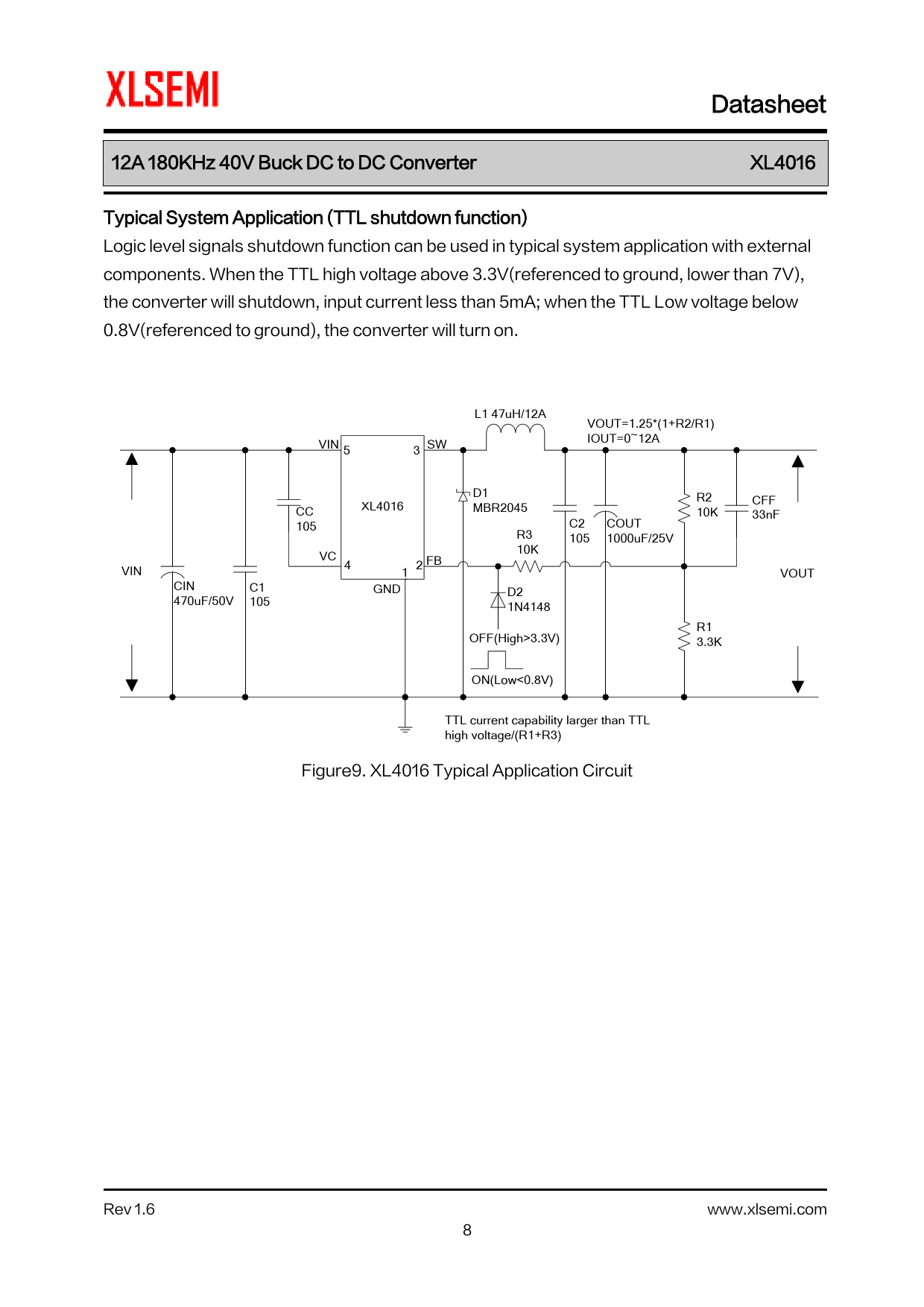 Datasheet 12A 180KHz 40V Buck DC to DC Converter XL4016 Typical System Application (TTL shutdown function) Logic level signals shutdown