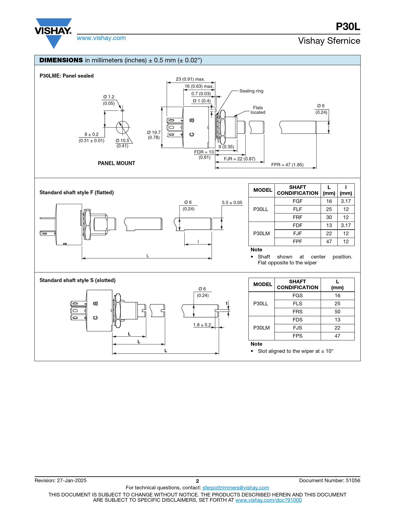 P30L. DIMENSIONS. P30LME: Panel sealed. PANEL MOUNT. SHAFT. MODEL. Standard shaft style F (flatted). CONDIFICATION (mm) (mm). Note