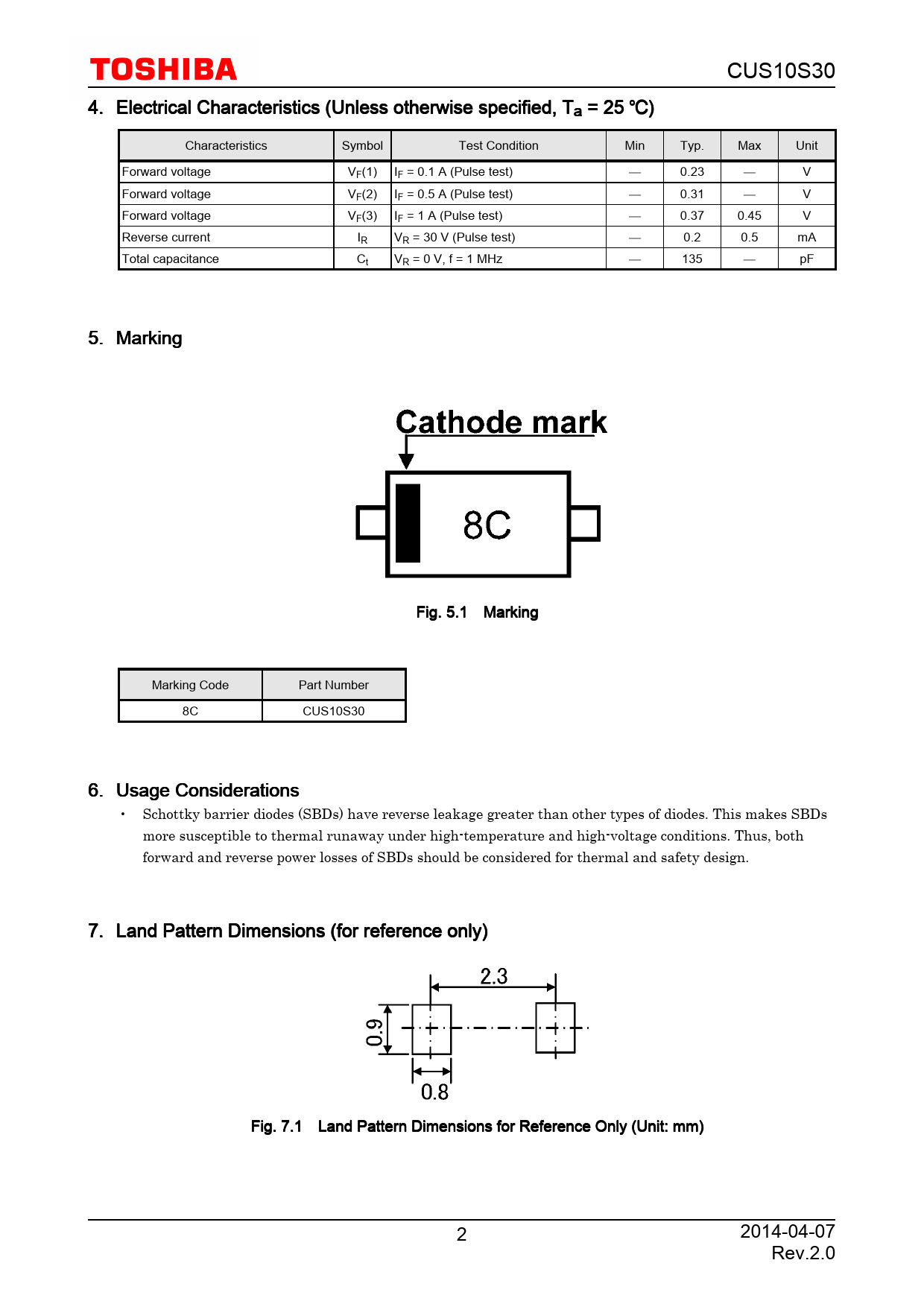 CUS10S30 4. Electrical Characteristics (Unless otherwise specified, Ta = 25 ) Characteristics Symbol Test Condition Min Typ. Max Unit Forward voltage VF(1) IF = 0.1 A (Pulse test) 0.23 V Forward voltage VF(2) IF = 0.5 A (Pulse test) 0.31 V Forward voltage VF(3) IF = 1 A (Pulse test) 0.37 0.45 V Reverse current IR VR = 30 V (Pulse test) 0.2 0.5 mA Total capacitance Ct VR = 0 V, f = 1 MHz 135 pF 5. Marking Fig. 5.1 Marking Marking Code Part Number 8C CUS10S30 6. Usage Considerations • Schottky barrier diodes (SBDs) have reverse leakage greater than other types of diodes. This makes SBDs more susceptible to thermal runaway under high-temperature and high-voltage conditions. Thus, both forward and reverse power losses of SBDs should be considered for thermal and safety design. 7. Land Pattern Dimensions (for reference only) Fig. 7.1 Land Pattern Dimensions for Reference Only (Unit: mm) 2 2014-04-07 Rev.2.0