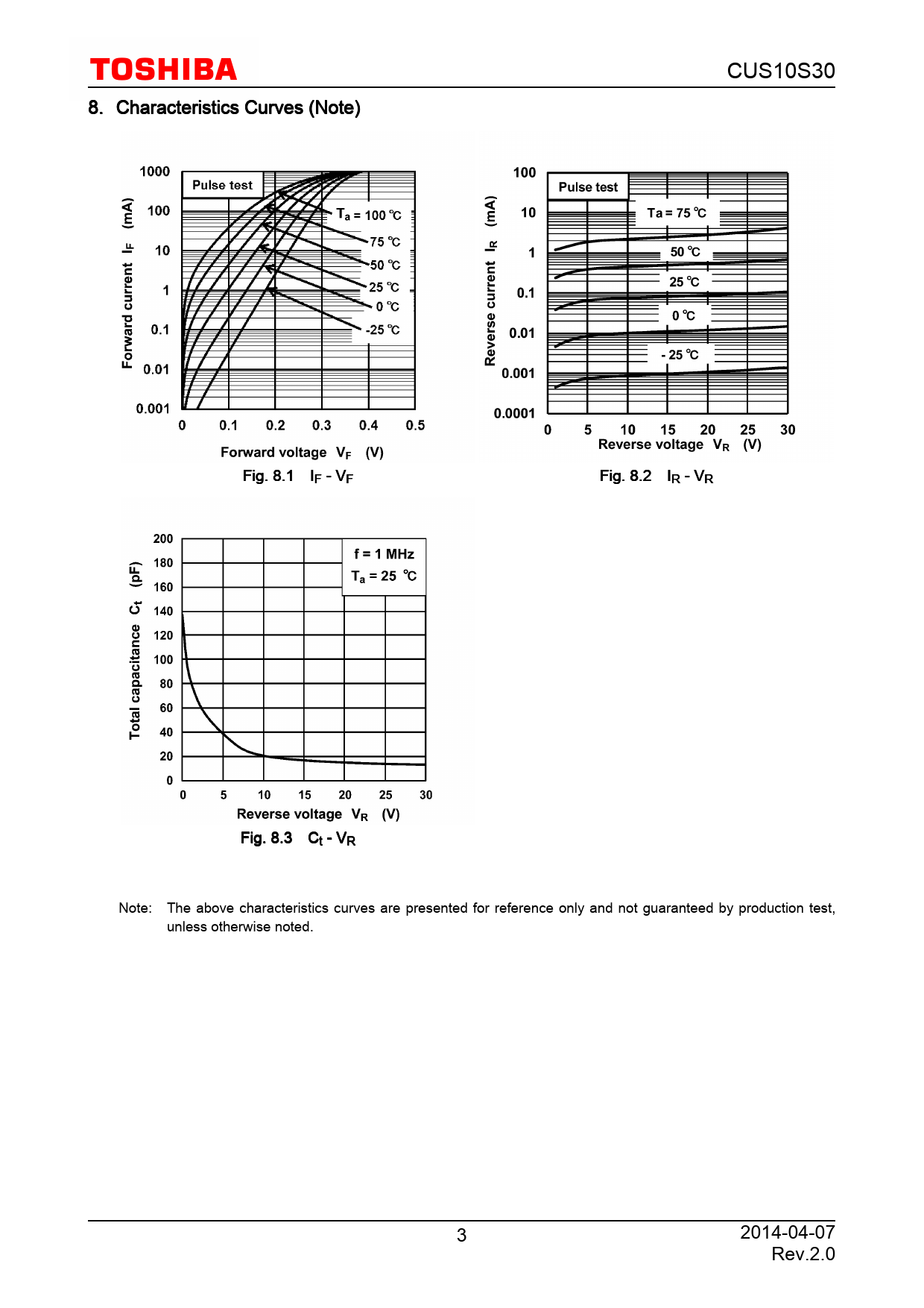 CUS10S30. 8. Characteristics. Curves. (Note). Fig. 8.1. IF. -. VF. Fig. 8.2. IR. -. VR. Fig. 8.3. Ct. -. VR. Note:. The. above. characteristics. curves. are. presented. for