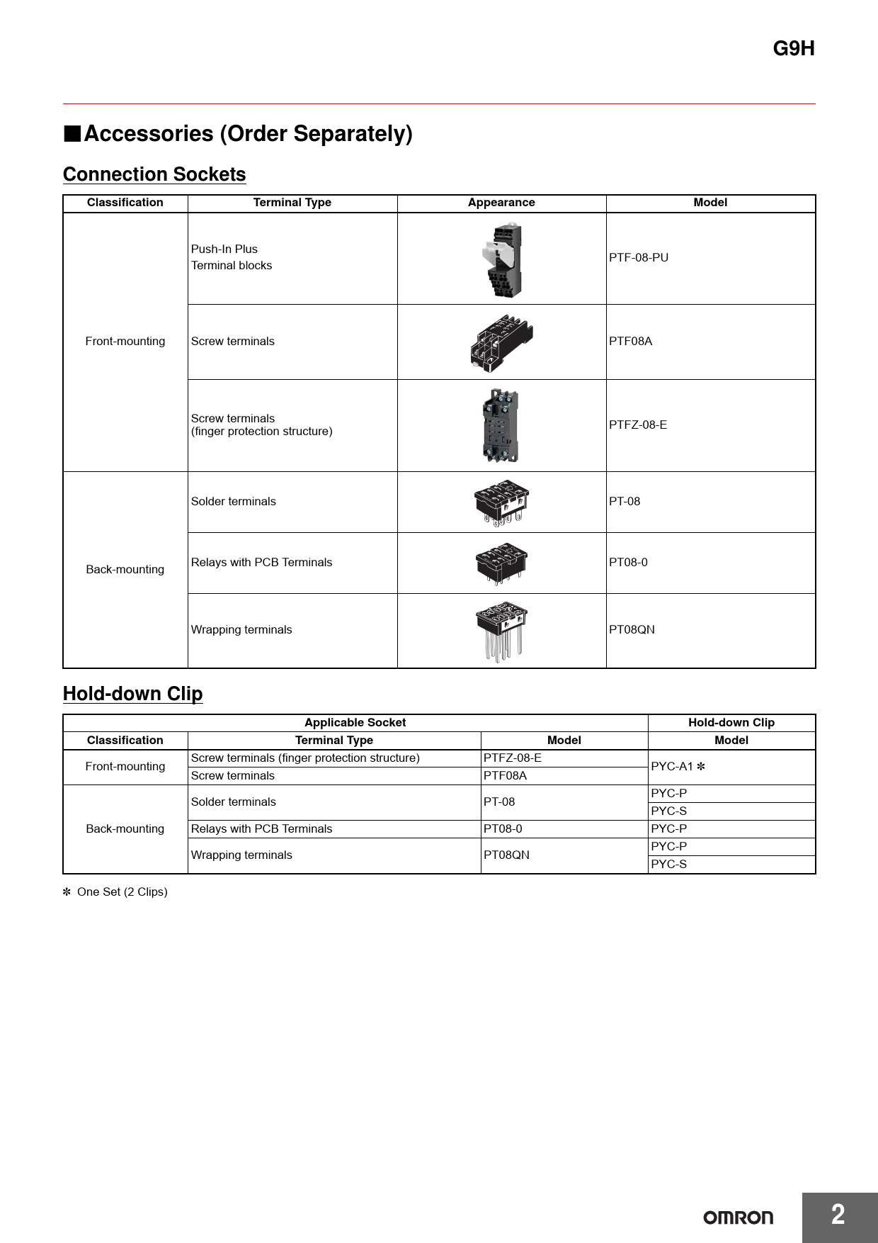 G9H. Accessories (Order Separately). Connection Sockets. Classification. Terminal Type. Appearance. Model. Hold-down Clip