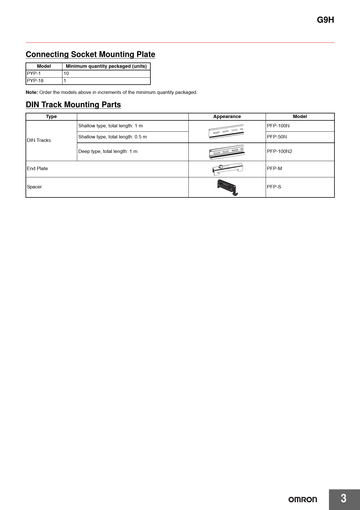 G9H. Connecting Socket Mounting Plate. Model. Minimum quantity packaged (units). Note:. DIN Track Mounting Parts. Type. Appearance
