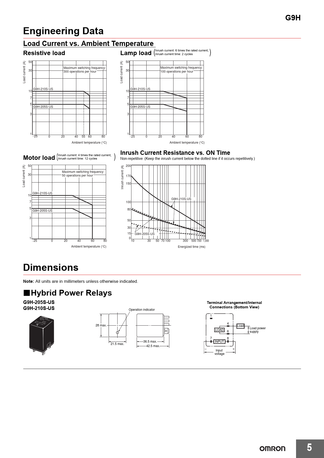 Hybrid Power Relays G9H-205S-US Terminal Arrangement/Internal Connections (Bottom View) G9H-210S-US