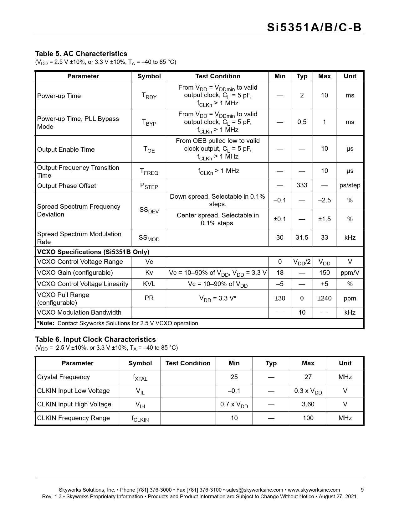 Si5351A/B/C-B. Table 5. AC Characteristics. Parameter. Symbol. Test Condition. Min. Typ. Max. Unit. VCXO Specifications (Si5351B Only)