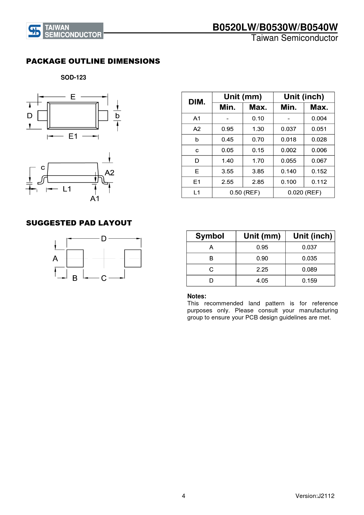 B0520LW/B0530W/B0540W. PACKAGE OUTLINE DIMENSIONS. SOD-123. SUGGESTED PAD LAYOUT. Notes: