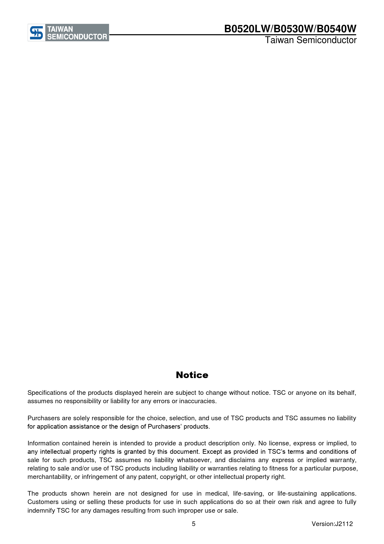B0520LW/B0530W/B0540W Taiwan Semiconductor Notice Specifications of the products displayed herein are subject to change without notice. TSC or anyone on its behalf, assumes no responsibility or liability for any errors or inaccuracies. Purchasers are solely responsible for the choice, selection, and use of TSC products and TSC assumes no liability for application assistance or the design of Purchasers’ products. Information contained herein is intended to provide a product description only. No license, express or implied, to any intel ectual property rights is granted by this document. Except as provided in TSC’s terms and conditions of sale for such products, TSC assumes no liability whatsoever, and disclaims any express or implied warranty, relating to sale and/or use of TSC products including liability or warranties relating to fitness for a particular purpose, merchantability, or infringement of any patent, copyright, or other intellectual property right. The products shown herein are not designed for use in medical, life-saving, or life-sustaining applications. Customers using or selling these products for use in such applications do so at their own risk and agree to fully indemnify TSC for any damages resulting from such improper use or sale. 5 Version:J2112