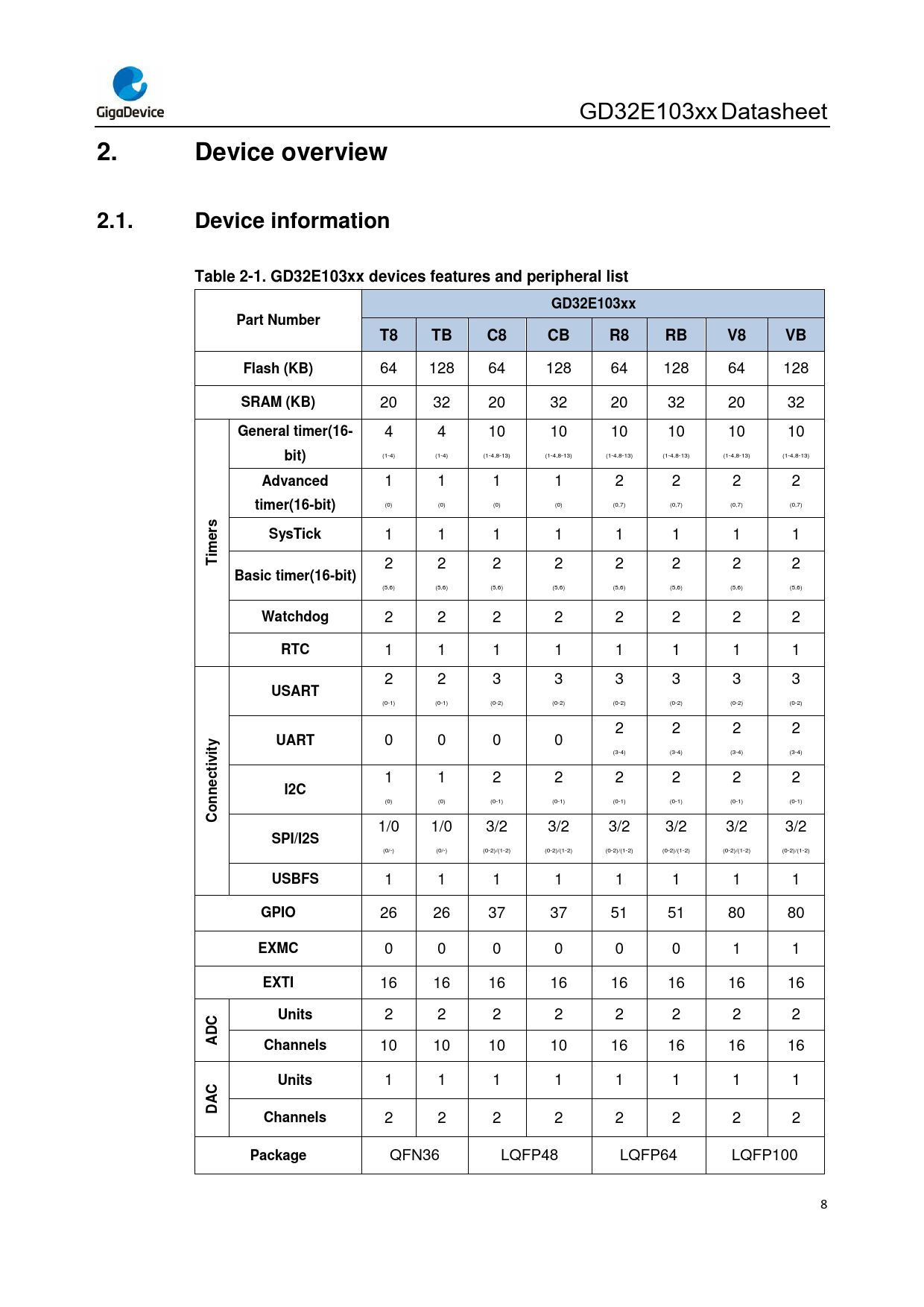 Device overview. 2.1. Device information. Table 2-1. GD32E103xx devices features and peripheral list. GD32E103xx. Part Number