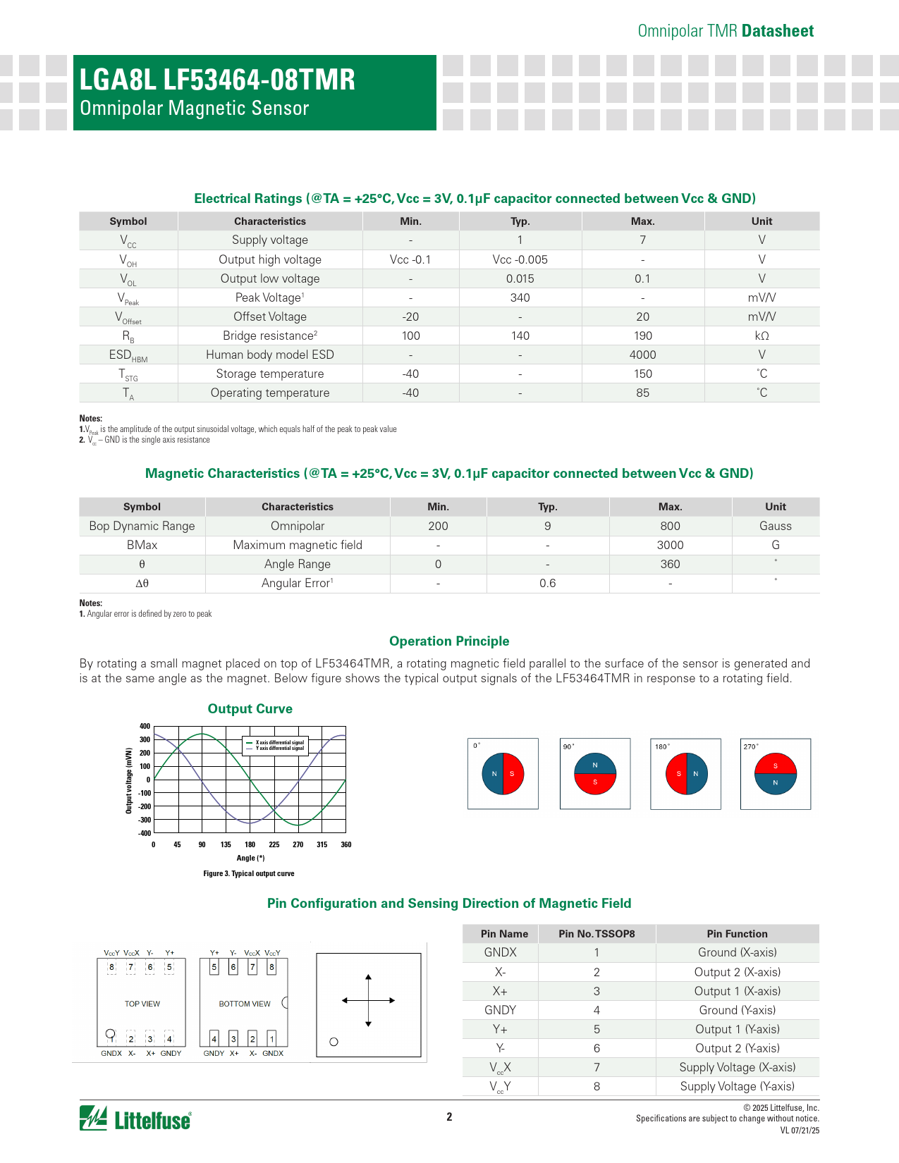 GNDX 1 Ground (X-axis) X- 2 Output 2 (X-axis) X+ 3 Output 1 (X-axis) GNDY 4 Ground (Y-axis) Y+ 5 Output 1 (Y-axis) Y- 6 Output 2 (Y-axis) V X 7 Supply Voltage (X-axis) cc V Y 8 Supply Voltage (Y-axis) cc © 2025 Littelfuse, Inc.