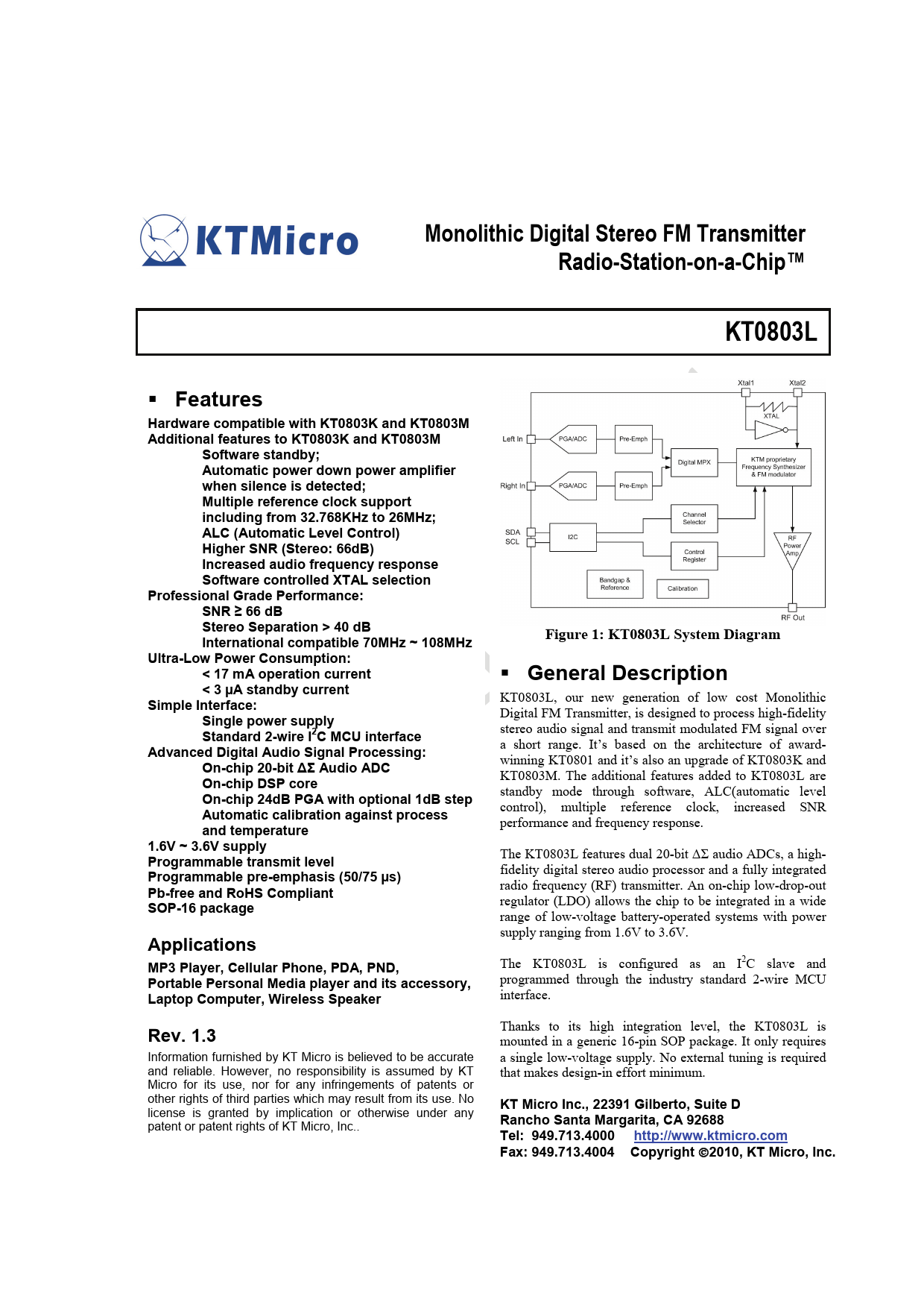 Features Hardware compatible with KT0803K and KT0803M Additional features to KT0803K and KT0803M Software standby; Automatic power down power amplifier when silence is detected; Multiple reference clock support including from 32.768KHz to 26MHz; ALC (Automatic Level Control) Higher SNR (Stereo: 66dB) Increased audio frequency response Software controlled XTAL selection Professional Grade Performance: SNR ≥ 66 dB Stereo Separation > 40 dB Figure 1: KT0803L System Diagram International compatible 70MHz ~ 108MHz Ultra-Low Power Consumption: < 17 mA operation current