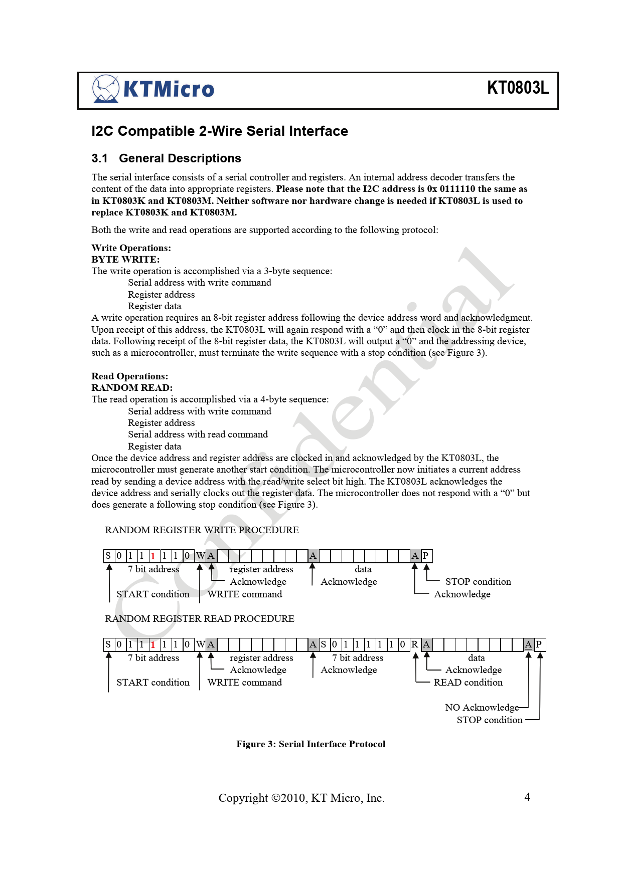 The write operation is accomplished via a 3-byte sequence: Serial address with write command Register address Register data A write operation requires an 8-bit register address following the device address word and acknowledgment. Upon receipt of this address, the KT0803L will again respond with a “0” and then clock in the 8-bit register data. Following receipt of the 8-bit register data, the KT0803L will output a “0” and the addressing device, such as a microcontroller, must terminate the write sequence with a stop condition (see Figure 3).