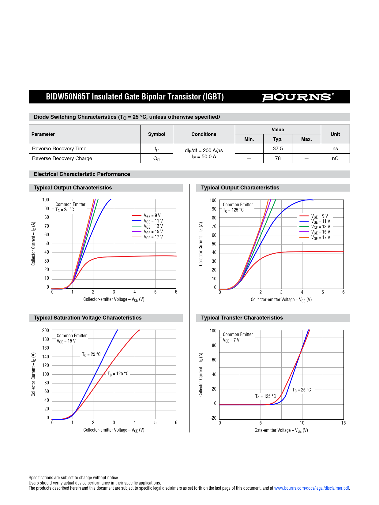 BIDW50N65T Insulated Gate Bipolar Transistor (IGBT)Diode Switching Characteristics (TC = 25 °C, unless otherwise specified)ValueParameterSymbolConditionsUnitMin.Typ.Max. Reverse Recovery Time trr dlF/dt = 200 A/µs — 37.5 — ns I Reverse Recovery Charge Q F = 50.0 A rr — 78 — nC Electrical Characteristic PerformanceTypical Output CharacteristicsTypical Output Characteristics 100 100 Common Emitter Common Emitter 90 TC = 25 °C 90 TC = 125 °C 80 VGE = 9 V 80 VGE = 9 V VGE = 11 V VGE = 11 V (A) 70 V (A) 70 V C GE = 13 V GE = 13 V V C V 60 GE = 15 V GE = 15 V V 60 GE = 17 V VGE = 17 V 50 50 40 40 30 30 Collector Current – I Collector Current – I 20 20 10 10 0 0 0 1 2 3 4 5 6 0 1 2 3 4 5 6 Collector-emitter Voltage – VCE (V) Collector-emitter Voltage – VCE (V) Typical Saturation Voltage CharacteristicsTypical Transfer Characteristics 200 100 Common Emitter Common Emitter 180 V V GE = 15 V CE = 7 V 160 80 T (A) 140 C = 25 °C C (A) C 60 120 100 TC = 125 °C 40 80 60 20 TC = 25 °C Collector Current – I Collector Current – I T 40 C = 125 °C 0 20 0 -20 0 1 2 3 4 5 6 0 5 10 15 Collector-emitter Voltage – VCE (V) Gate-emitter Voltage – VGE (V) Specifications are subject to change without notice. Users should verify actual device performance in their specific applications. The products described herein and this document are subject to specific legal disclaimers as set forth on the last page of this document, and at www.bourns.com/docs/legal/disclaimer.pdf.