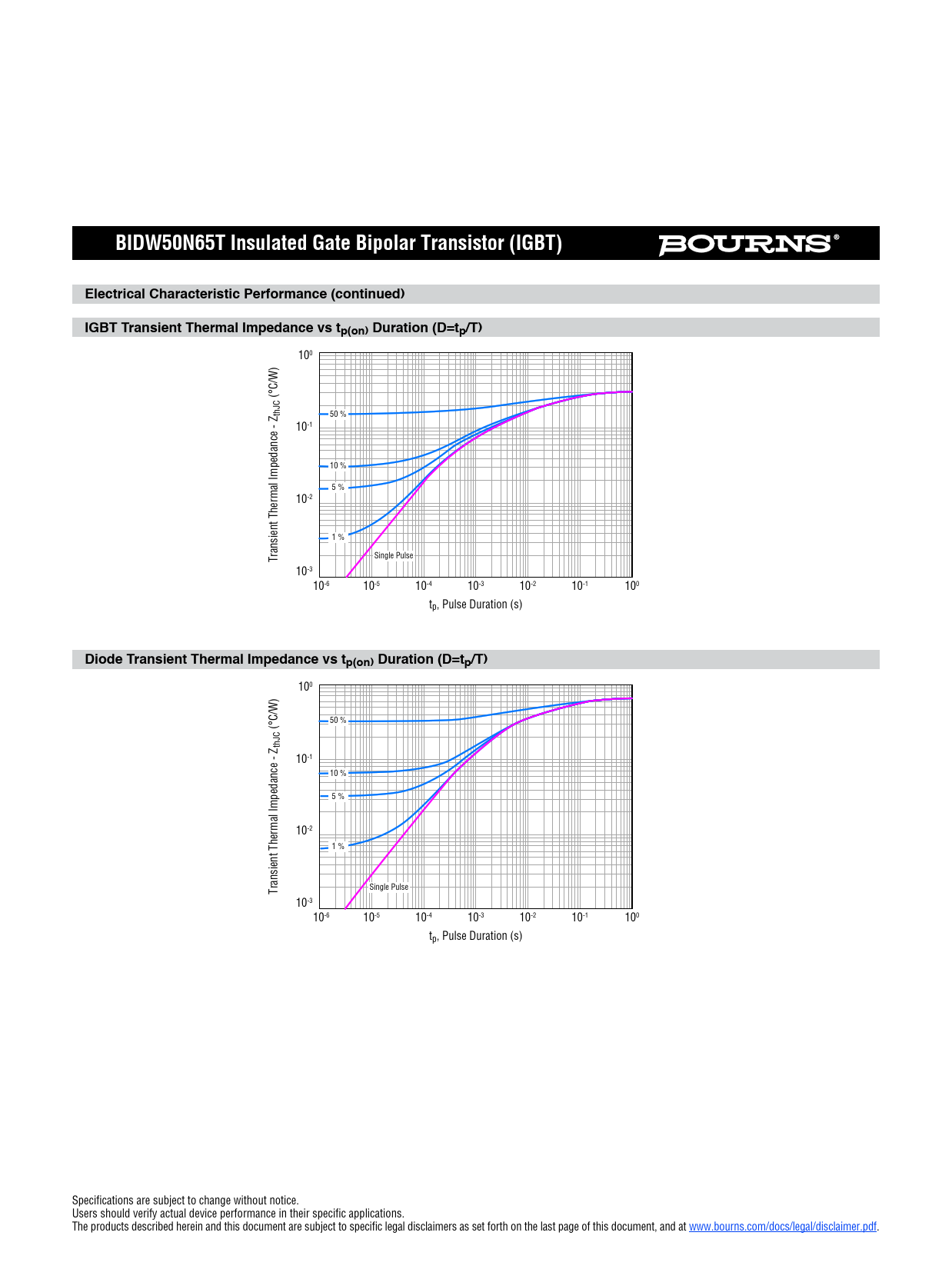 100 50 % (°C/W) thJC 10-1 10 % 5 % 10-2 1 % Transient Thermal Impedance - Z Single Pulse 10-3 10-6 10-5 10-4 10-3 10-2 100 10-1 tp, Pulse Duration (s) Specifications are subject to change without notice. Users should verify actual device performance in their specific applications. The products described herein and this document are subject to specific legal disclaimers as set forth on the last page of this document, and at www.bourns.com/docs/legal/disclaimer.pdf.