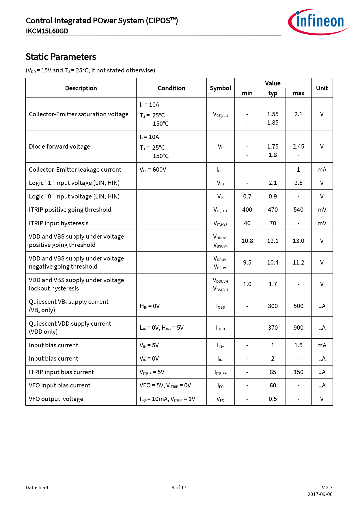页数 / 页17 / 9 — Control. Integrated. POwer. System. (CIPOS™). IKCM15L60GD. Static. …