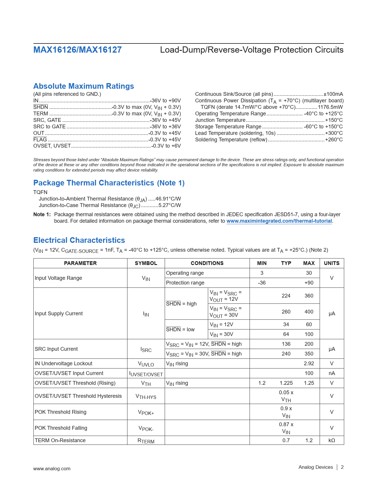 MAX16126/MAX16127 Load-Dump/Reverse-Voltage Protection Circuits Absolute Maximum Ratings (All pins referenced to GND.) Continuous Sink/Source (all pins) ..±100mA IN ..-36V to +90V Continuous Power Dissipation (TA = +70°C) (multilayer board) SHDN ...-0.3V to max (0V, VIN + 0.3V) TQFN (derate 14.7mW/°C above +70°C)...1176.5mW TERM ...-0.3V to max (0V, VIN + 0.3V) Operating Temperature Range ... -40°C to +125°C SRC, GATE ..-36V to +45V Junction Temperature ..+150°C SRC to GATE ...-36V to +36V Storage Temperature Range .. -60°C to +150°C OUT ...-0.3V to +45V Lead Temperature (soldering, 10s) ...+300°C FLAG ...-0.3V to +45V Soldering Temperature (reflow) ...+260°C OVSET, UVSET ...-0.3V to +6V Stresses beyond those listed under “Absolute Maximum Ratings” may cause permanent damage to the device. These are stress ratings only, and functional operation of the device at these or any other conditions beyond those indicated in the operational sections of the specifications is not implied. Exposure to absolute maximum rating conditions for extended periods may affect device reliability. Package Thermal Characteristics (Note 1) TQFN Junction-to-Ambient Thermal Resistance (θJA) ...46.91°C/W Junction-to-Case Thermal Resistance (θJC) ..5.27°C/W Note 1: Package thermal resistances were obtained using the method described in JEDEC specification JESD51-7, using a four-layer board. For detailed information on package thermal considerations, refer to www.maximintegrated.com/thermal-tutorial . Electrical Characteristics (VIN = 12V, CGATE-SOURCE = 1nF, TA = -40°C to +125°C, unless otherwise noted. Typical values are at TA = +25°C.) (Note 2) PARAMETERSYMBOLCONDITIONSMINTYPMAXUNITS Operating range 3 30 Input Voltage Range VIN V Protection range -36 +90 VIN = VSRC = V SHDN = high OUT = 12V 224 360 VIN = VSRC = Input Supply Current IIN µA VOUT = 30V 260 400 VIN = 12V 34 60 SHDN = low VIN = 30V 64 100 V SRC Input Current I SRC = VIN = 12V, SHDN = high 136 200 SRC µA VSRC = VIN = 30V, SHDN = high 240 350 IN Undervoltage Lockout VUVLO VIN rising 2.92 V OVSET/UVSET Input Current IUVSET/OVSET 100 nA OVSET/UVSET Threshold (Rising) VTH VIN rising 1.2 1.225 1.25 V OVSET/UVSET Threshold Hysteresis V 0.05 x TH-HYS V V TH POK Threshold Rising V 0.9 x POK+ V V IN POK Threshold Falling V 0.87 x POK- V V IN TERM On-Resistance RTERM 0.7 1.2 kΩ www.analog.com Analog Devices │ 2