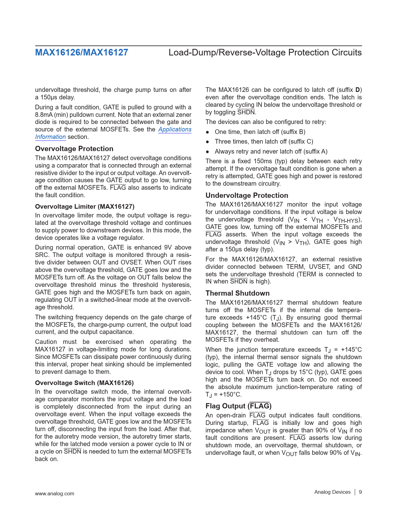 ● Always retry and never latch off (suffix A) The MAX16126/MAX16127 detect overvoltage conditions using a comparator that is connected through an external There is a fixed 150ms (typ) delay between each retry resistive divider to the input or output voltage. An overvolt- attempt. If the overvoltage fault condition is gone when a age condition causes the GATE output to go low, turning retry is attempted, GATE goes high and power is restored off the external MOSFETs. to the downstream circuitry. FLAG also asserts to indicate the fault condition.