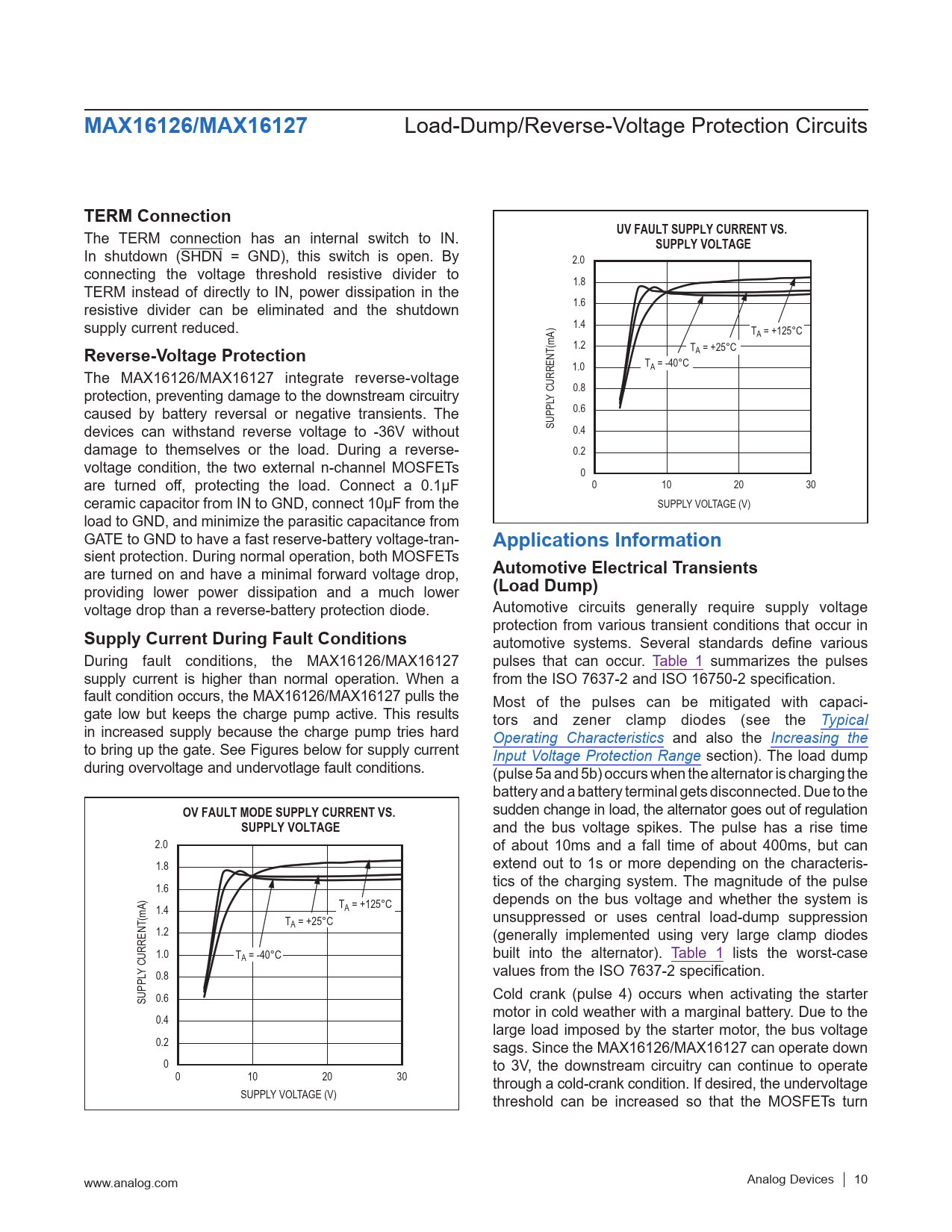 link to page 11 link to page 4 link to page 4 link to page 13 link to page 13 link to page 11 MAX16126/MAX16127 Load-Dump/Reverse-Voltage Protection Circuits TERM Connection The TERM connection has an internal switch to IN. UV FAULT SUPPLY CURRENT VS.SUPPLY VOLTAGE In shutdown (SHDN = GND), this switch is open. By 2.0 connecting the voltage threshold resistive divider to 1.8 TERM instead of directly to IN, power dissipation in the resistive divider can be eliminated and the shutdown 1.6 supply current reduced. 1.4 TA = +125°C Reverse-Voltage Protection 1.2 TA = +25°C 1.0 TA = -40°C The MAX16126/MAX16127 integrate reverse-voltage protection, preventing damage to the downstream circuitry 0.8 CURRENT(mA) LY caused by battery reversal or negative transients. The 0.6 devices can withstand reverse voltage to -36V without SUPP 0.4 damage to themselves or the load. During a reverse- 0.2 voltage condition, the two external n-channel MOSFETs 0 are turned off, protecting the load. Connect a 0.1µF 0 10 20 30 ceramic capacitor from IN to GND, connect 10µF from the SUPPLY VOLTAGE (V) load to GND, and minimize the parasitic capacitance from GATE to GND to have a fast reserve-battery voltage-tran- Applications Information sient protection. During normal operation, both MOSFETs are turned on and have a minimal forward voltage drop, Automotive Electrical Transients providing lower power dissipation and a much lower (Load Dump) voltage drop than a reverse-battery protection diode. Automotive circuits generally require supply voltage protection from various transient conditions that occur in Supply Current During Fault Conditions automotive systems. Several standards define various During fault conditions, the MAX16126/MAX16127 pulses that can occur. Table 1 summarizes the pulses supply current is higher than normal operation. When a from the ISO 7637-2 and ISO 16750-2 specification. fault condition occurs, the MAX16126/MAX16127 pulls the Most of the pulses can be mitigated with capaci- gate low but keeps the charge pump active. This results tors and zener clamp diodes (see the Typical in increased supply because the charge pump tries hard Operating Characteristics and also the Increasing the to bring up the gate. See Figures below for supply current Input Voltage Protection Range section). The load dump during overvoltage and undervotlage fault conditions. (pulse 5a and 5b) occurs when the alternator is charging the battery and a battery terminal gets disconnected. Due to the OV FAULT MODE SUPPLY CURRENT VS. sudden change in load, the alternator goes out of regulation SUPPLY VOLTAGE and the bus voltage spikes. The pulse has a rise time 2.0 of about 10ms and a fall time of about 400ms, but can 1.8 extend out to 1s or more depending on the characteris- tics of the charging system. The magnitude of the pulse 1.6 T depends on the bus voltage and whether the system is 1.4 A = +125°C T unsuppressed or uses central load-dump suppression A = +25°C 1.2 (generally implemented using very large clamp diodes 1.0 TA = -40°C built into the alternator). Table 1 lists the worst-case CURRENT(mA) Y 0.8 values from the ISO 7637-2 specification. SUPPL 0.6 Cold crank (pulse 4) occurs when activating the starter motor in cold weather with a marginal battery. Due to the 0.4 large load imposed by the starter motor, the bus voltage 0.2 sags. Since the MAX16126/MAX16127 can operate down 0 to 3V, the downstream circuitry can continue to operate 0 10 20 30 through a cold-crank condition. If desired, the undervoltage SUPPLY VOLTAGE (V) threshold can be increased so that the MOSFETs turn www.analog.com Analog Devices │ 10