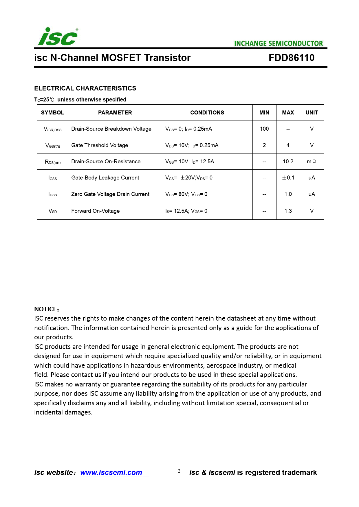 isc N-Channel MOSFET TransistorFDD86110ELECTRICAL CHARACTERISTICS TC=25 ℃ unless otherwise specifiedSYMBOLPARAMETERCONDITIONSMINMAXUNIT V(BR)DSS Drain-Source Breakdown Voltage VGS= 0; ID= 0.25mA 100 -- V VGS(th) Gate Threshold Voltage VDS= 10V; ID= 0.25mA 2 4 V RDS(on) Drain-Source On-Resistance VGS= 10V; ID= 12.5A -- 10.2 mΩ IGSS Gate-Body Leakage Current VGS= ±20V;VDS= 0 -- ±0.1 uA IDSS Zero Gate Voltage Drain Current VDS= 80V; VGS= 0 -- 1.0 uA VSD Forward On-Voltage IS= 12.5A; VGS= 0 -- 1.3 V NOTICE : ISC reserves the rights to make changes of the content herein the datasheet at any time without notification. The information contained herein is presented only as a guide for the applications of our products. ISC products are intended for usage in general electronic equipment. The products are not designed for use in equipment which require specialized quality and/or reliability, or in equipment which could have applications in hazardous environments, aerospace industry, or medical field. Please contact us if you intend our products to be used in these special applications. ISC makes no warranty or guarantee regarding the suitability of its products for any particular purpose, nor does ISC assume any liability arising from the application or use of any products, and specifical y disclaims any and al liability, including without limitation special, consequential or incidental damages. isc website : www.iscsemi.com 2 isc & iscsemiis registered trademark Document Outline isc N-Channel MOSFET Transistor FDD FEATURES DESCRIPTION ABSOLUTE MAXIMUM RATINGS(Ta=25℃) ELECTRICAL CHARACTERISTICS