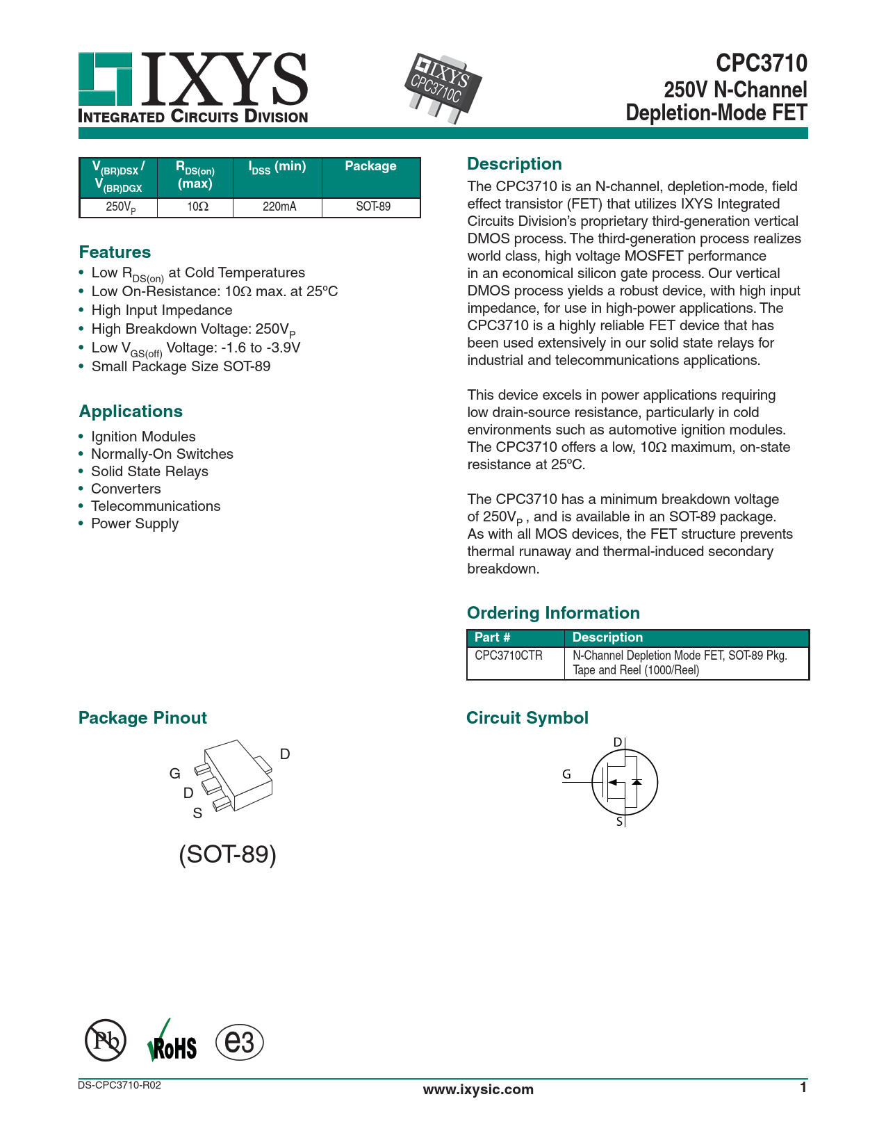 CPC3710250V N-Channel INTEGRATED CIRCUITS DIVISION Depletion-Mode FETV/RI(min)PackageDescription(BR)DSXDS(on)DSSV(max)(BR)DGX The CPC3710 is an N-channel, depletion-mode, field 250V 10 220mA SOT-89 effect transistor (FET) that utilizes IXYS Integrated P Circuits Division’s proprietary third-generation vertical DMOS process. The third-generation process realizes Features world class, high voltage MOSFET performance • Low R at Cold Temperatures in an economical silicon gate process. Our vertical DS(on) • Low On-Resistance: 10 max. at 25ºC DMOS process yields a robust device, with high input • High Input Impedance impedance, for use in high-power applications. The • High Breakdown Voltage: 250V CPC3710 is a highly reliable FET device that has P • Low V Voltage: -1.6 to -3.9V been used extensively in our solid state relays for GS(off) • Small Package Size SOT-89 industrial and telecommunications applications. This device excels in power applications requiring Applications low drain-source resistance, particularly in cold environments such as automotive ignition modules. • Ignition Modules The CPC3710 offers a low, 10 maximum, on-state • Normally-On Switches resistance at 25ºC. • Solid State Relays • Converters The CPC3710 has a minimum breakdown voltage • Telecommunications of 250V , and is available in an SOT-89 package. • Power Supply P As with all MOS devices, the FET structure prevents thermal runaway and thermal-induced secondary breakdown. Ordering InformationPart #Description CPC3710CTR N-Channel Depletion Mode FET, SOT-89 Pkg. Tape and Reel (1000/Reel) Package PinoutCircuit Symbol D D G G D S S (SOT-89) DS-CPC3710-R02 www.ixysic.com1 Document Outline CPC3710a Disclaimer