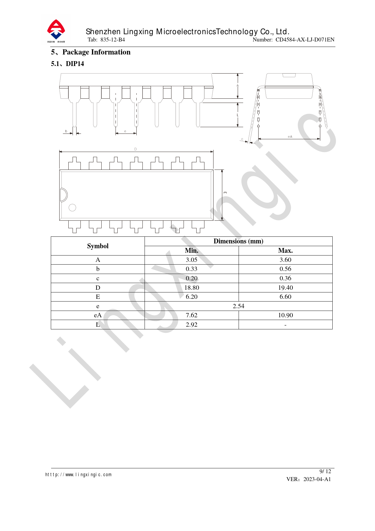 | 页数 / 页 | 12 / 9 — Package Information. 5.1. DIP14. Dimensions (mm). Symbol. Min. Max |