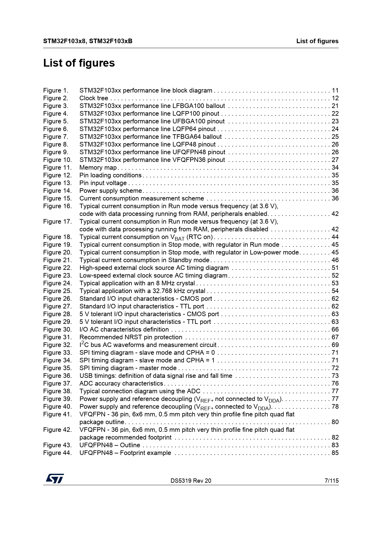 link to page 11 link to page 12 link to page 21 link to page 22 link to page 23 link to page 24 link to page 25 link to page 26 link to page 26 link to page 27 link to page 34 link to page 35 link to page 35 link to page 36 link to page 36 link to page 42 link to page 42 link to page 44 link to page 45 link to page 45 link to page 46 link to page 51 link to page 52 link to page 53 link to page 54 link to page 62 link to page 62 link to page 63 link to page 63 link to page 66 link to page 67 link to page 69 link to page 71 link to page 71 link to page 72 link to page 73 link to page 76 link to page 77 link to page 77 link to page 78 link to page 80 link to page 82 link to page 114 STM32F103x8, STM32F103xBList of figuresList of figures Figure 1. STM32F103xx performance line block diagram . 11 Figure 2. Clock tree . 12 Figure 3. STM32F103xx performance line LFBGA100 ballout . 21 Figure 4. STM32F103xx performance line LQFP100 pinout . 22 Figure 5. STM32F103xx performance line UFBGA100 pinout . 23 Figure 6. STM32F103xx performance line LQFP64 pinout . 24 Figure 7. STM32F103xx performance line TFBGA64 ballout . 25 Figure 8. STM32F103xx performance line LQFP48 pinout . 26 Figure 9. STM32F103xx performance line UFQFPN48 pinout . 26 Figure 10. STM32F103xx performance line VFQFPN36 pinout . 27 Figure 11. Memory map . 34 Figure 12. Pin loading conditions. 35 Figure 13. Pin input voltage . 35 Figure 14. Power supply scheme. 36 Figure 15. Current consumption measurement scheme . 36 Figure 16. Typical current consumption in Run mode versus frequency (at 3.6 V), code with data processing running from RAM, peripherals enabled. 42 Figure 17. Typical current consumption in Run mode versus frequency (at 3.6 V), code with data processing running from RAM, peripherals disabled . 42 Figure 18. Typical current consumption on VBAT (RTC on) . 44 Figure 19. Typical current consumption in Stop mode, with regulator in Run mode . 45 Figure 20. Typical current consumption in Stop mode, with regulator in Low-power mode. 45 Figure 21. Typical current consumption in Standby mode . 46 Figure 22. High-speed external clock source AC timing diagram . 51 Figure 23. Low-speed external clock source AC timing diagram . 52 Figure 24. Typical application with an 8 MHz crystal . 53 Figure 25. Typical application with a 32.768 kHz crystal . 54 Figure 26. Standard I/O input characteristics - CMOS port . 62 Figure 27. Standard I/O input characteristics - TTL port . 62 Figure 28. 5 V tolerant I/O input characteristics - CMOS port . 63 Figure 29. 5 V tolerant I/O input characteristics - TTL port . 63 Figure 30. I/O AC characteristics definition . 66 Figure 31. Recommended NRST pin protection . 67 Figure 32. I2C bus AC waveforms and measurement circuit . 69 Figure 33. SPI timing diagram - slave mode and CPHA = 0 . 71 Figure 34. SPI timing diagram - slave mode and CPHA = 1 . 71 Figure 35. SPI timing diagram - master mode . 72 Figure 36. USB timings: definition of data signal rise and fall time . 73 Figure 37. ADC accuracy characteristics . 76 Figure 38. Typical connection diagram using the ADC . 77 Figure 39. Power supply and reference decoupling (VREF+ not connected to VDDA). 77 Figure 40. Power supply and reference decoupling (VREF+ connected to VDDA). 78 Figure 41. VFQFPN - 36 pin, 6x6 mm, 0.5 mm pitch very thin profile fine pitch quad flat package outline. 80 Figure 42. VFQFPN - 36 pin, 6x6 mm, 0.5 mm pitch very thin profile fine pitch quad flat package recommended footprint . 82 Figure 43. UFQFPN48 – Outline . 83 Figure 44. UFQFPN48 – Footprint example . 85 DS5319 Rev 20 7/115 8 Document Outline Table 1. Device summary 1 Introduction 2 Description 2.1 Device overview Table 2. STM32F103xx medium-density device features and peripheral counts Figure 1. STM32F103xx performance line block diagram Figure 2. Clock tree 2.2 Full compatibility throughout the family Table 3. STM32F103xx family 2.3 Overview 2.3.1 Arm® Cortex®-M3 core with embedded flash and SRAM 2.3.2 Embedded flash memory 2.3.3 CRC (cyclic redundancy check) calculation unit 2.3.4 Embedded SRAM 2.3.5 Nested vectored interrupt controller (NVIC) 2.3.6 External interrupt/event controller (EXTI) 2.3.7 Clocks and startup 2.3.8 Boot modes 2.3.9 Power supply schemes 2.3.10 Power supply supervisor 2.3.11 Voltage regulator 2.3.12 Low-power modes 2.3.13 DMA 2.3.14 RTC (real-time clock) and backup registers 2.3.15 Timers and watchdogs Table 4. Timer feature comparison 2.3.16 I²C bus 2.3.17 Universal synchronous/asynchronous receiver transmitter (USART) 2.3.18 Serial peripheral interface (SPI) 2.3.19 Controller area network (CAN) 2.3.20 Universal serial bus (USB) 2.3.21 GPIOs (general-purpose inputs/outputs) 2.3.22 ADC (analog-to-digital converter) 2.3.23 Temperature sensor 2.3.24 Serial wire JTAG debug port (SWJ-DP) 3 Pinouts and pin description Figure 3. STM32F103xx performance line LFBGA100 ballout Figure 4. STM32F103xx performance line LQFP100 pinout Figure 5. STM32F103xx performance line UFBGA100 pinout Figure 6. STM32F103xx performance line LQFP64 pinout Figure 7. STM32F103xx performance line TFBGA64 ballout Figure 8. STM32F103xx performance line LQFP48 pinout Figure 9. STM32F103xx performance line UFQFPN48 pinout Figure 10. STM32F103xx performance line VFQFPN36 pinout Table 5. Medium-density STM32F103xx pin definitions (continued) 4 Memory mapping Figure 11. Memory map 5 Electrical characteristics 5.1 Parameter conditions 5.1.1 Minimum and maximum values 5.1.2 Typical values 5.1.3 Typical curves 5.1.4 Loading capacitor 5.1.5 Pin input voltage Figure 12. Pin loading conditions Figure 13. Pin input voltage 5.1.6 Power supply scheme Figure 14. Power supply scheme 5.1.7 Current consumption measurement Figure 15. Current consumption measurement scheme 5.2 Absolute maximum ratings Table 6. Voltage characteristics Table 7. Current characteristics Table 8. Thermal characteristics 5.3 Operating conditions 5.3.1 General operating conditions Table 9. General operating conditions 5.3.2 