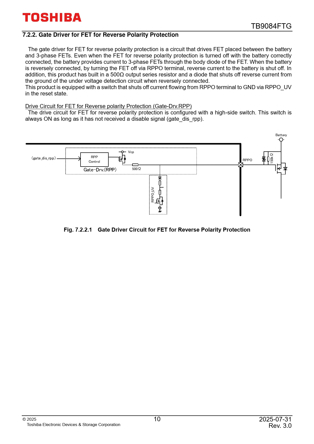 © 2025 10 2025-07-31 Toshiba Electronic Devices & Storage Corporation Rev. 3.0 Document Outline 1. Description 2. Applications 3. Features 4. Block Diagram 5. Pin Assignments Top view 6. Pin Description 7. Functional Description 7.1. Charge Pump Circuit 7.2. Gate Driver Circuits 7.2.1. Gate Drivers for Driving 3-Phase FETs 7.2.2. Gate Driver for FET for Reverse Polarity Protection 7.3. Current Sensing Circuit 7.3.1. Configuration 7.3.2. Offset Calibration 7.4. Oscillation Circuit 7.5. Abnormality Flag Output Function 7.5.1. NDIAG Terminal Output 7.5.2. Status Registers in SPI communication 7.6. Abnormality Detection Circuits 7.6.1. VCC Under Voltage Detection Function 7.6.2. VB Under Voltage Detection Function 7.6.3. RPPO Under Voltage Detection Function 7.6.4. VCC Over Voltage Detection Function 7.6.5. VCP Over Voltage Detection Function 7.6.6. Over temperature Detection Function 7.6.7. VDS Detection Function for 3-Phase FETs 7.6.8. Abnormality Detection for CP1SW and CP2SW Terminals 7.7. Alarm Input Circuit 7.8. SPI Communication Circuit 7.8.1. SPI Communication Operation 7.8.2. Error Judgment 7.8.3. Register Map 7.8.3.1. CONFIG1 Write Address=2h / Read Address=3h 7.8.3.2. CONFIG2 Write Address=4h / Read Address=5h 7.8.3.3. CONFIG3 Write Address=6h / Read Address=7h 7.8.3.4. CONFIG4 (Write Address=8h / Read Address=9h 7.8.3.5. CONFIG5 Write Address=Ah / Read Address=Bh 7.8.3.6. STAT1 / Read Address=Dh 7.8.3.7. STAT2 / Read Address=Fh 7.8.3.8. STAT1_CLR Write Address=10h 7.8.3.9. STAT2_CLR Write Address=12h 7.8.3.10. NOP Write Address=Fh / Read Address=Fh 8. Absolute Maximum Ratings (Ta = 25 C) 9. Electrical Characteristics 9.1. Operating Voltage Ranges 9.2. Consumption Current 9.3. Charge Pump Circuit 9.4. Gate Driver Circuits 9.5. Current Sense Amplifier Circuit 9.6. Oscillation Circuit 9.7. Abnormality Detection Circuits 9.8. Alarm Input Circuit 9.9. SPI Communication Circuit 10. Application Circuit Example 11. Package Outlines 12. Revision History 13. Abbreviation Collection RESTRICTIONS ON PRODUCT USE