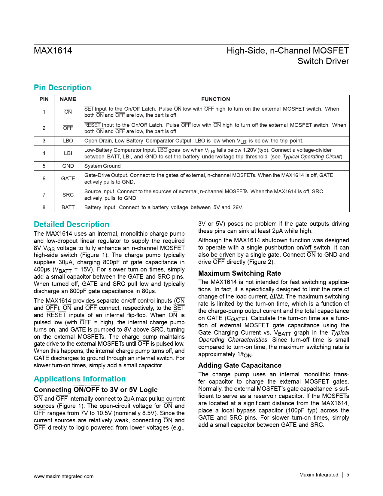 Pin Description PIN NAME FUNCTION Detailed Description Maximum Switching Rate Adding Gate Capacitance Applications Information