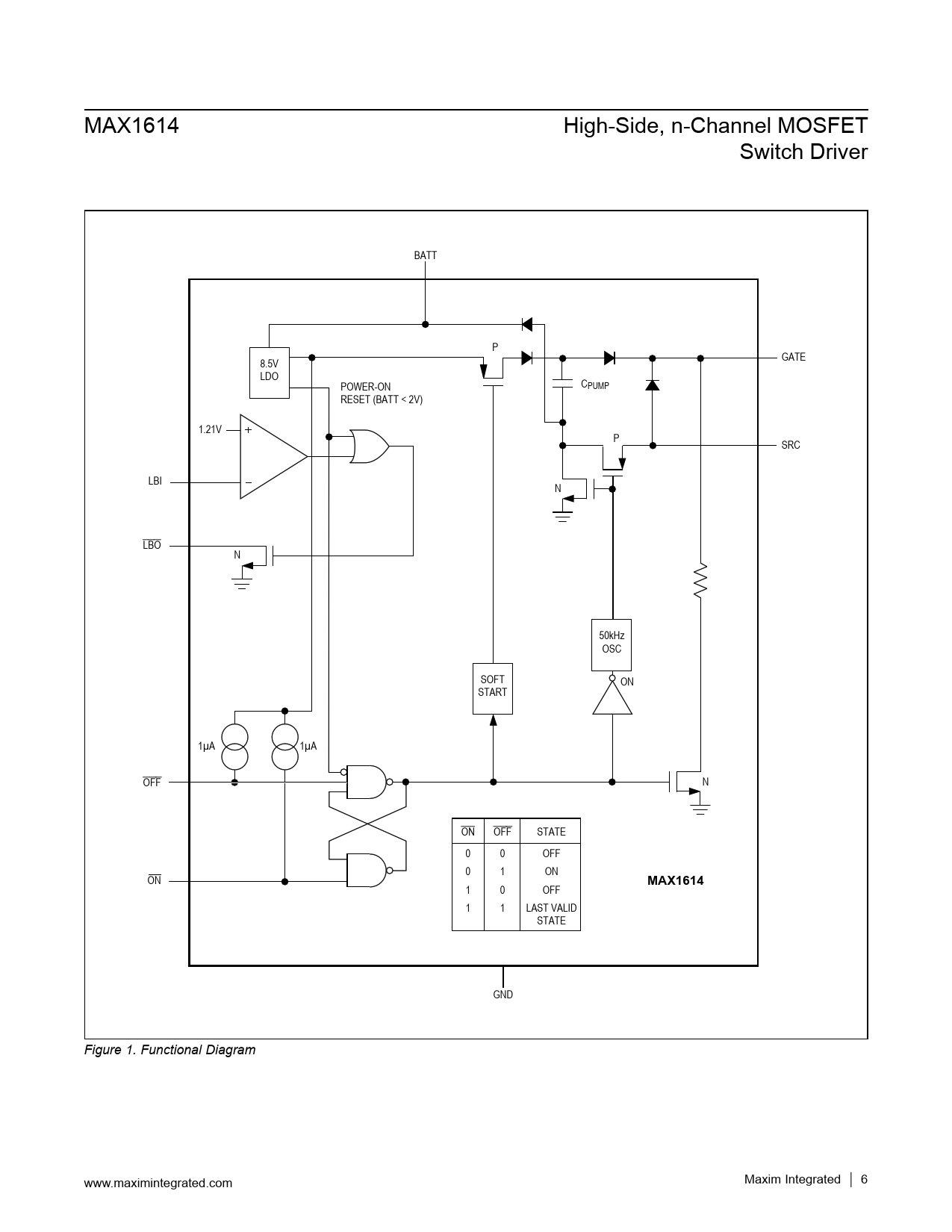 MAX1614 High-Side, n-Channel MOSFET Switch Driver BATT P 8.5V GATE LDO POWER-ON CPUMP RESET (BATT < 2V) 1.21V P SRC LBI N LBO N 50kHz OSC SOFT ON START 1µA 1µA OFF N ON OFF STATE 0 0 OFF 0 1 ON ON MAX1614 1 0 OFF 1 1 LAST VALID STATE GND Figure 1. Functional Diagram www.maximintegrated.com Maxim Integrated │ 6