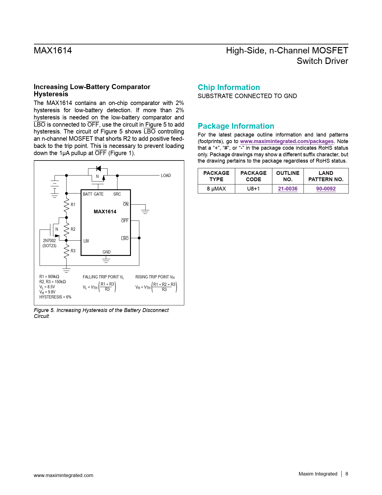 hysteresis. The circuit of Figure 5 shows LBO controlling For the latest package outline information and land patterns an n-channel MOSFET that shorts R2 to add positive feed- (footprints), go to