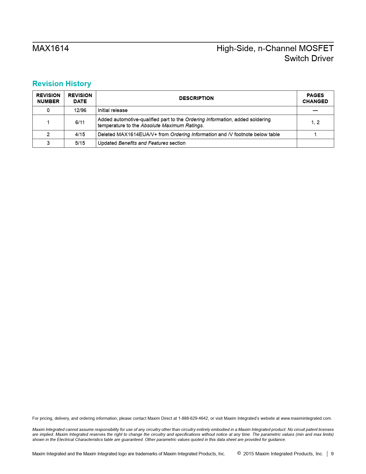 0 12/96 Initial release — 1 6/11 Added automotive-qualified part to the Ordering Information, added soldering temperature to the Absolute Maximum Ratings. 1, 2 2 4/15 Deleted MAX1614EUA/V+ from Ordering Information and /V footnote below table 1 3 5/15 Updated Benefits and Features section For pricing, delivery, and ordering information, please contact Maxim Direct at 1-888-629-4642, or visit Maxim Integrated’s website at www.maximintegrated.com. Maxim Integrated cannot assume responsibility for use of any circuitry other than circuitry entirely embodied in a Maxim Integrated product. No circuit patent licenses are implied. Maxim Integrated reserves the right to change the circuitry and specifications without notice at any time. The parametric values (min and max limits) shown in the Electrical Characteristics table are guaranteed. Other parametric values quoted in this data sheet are provided for guidance. Maxim Integrated and the Maxim Integrated logo are trademarks of Maxim Integrated Products, Inc. © 2015 Maxim Integrated Products, Inc. │ 9