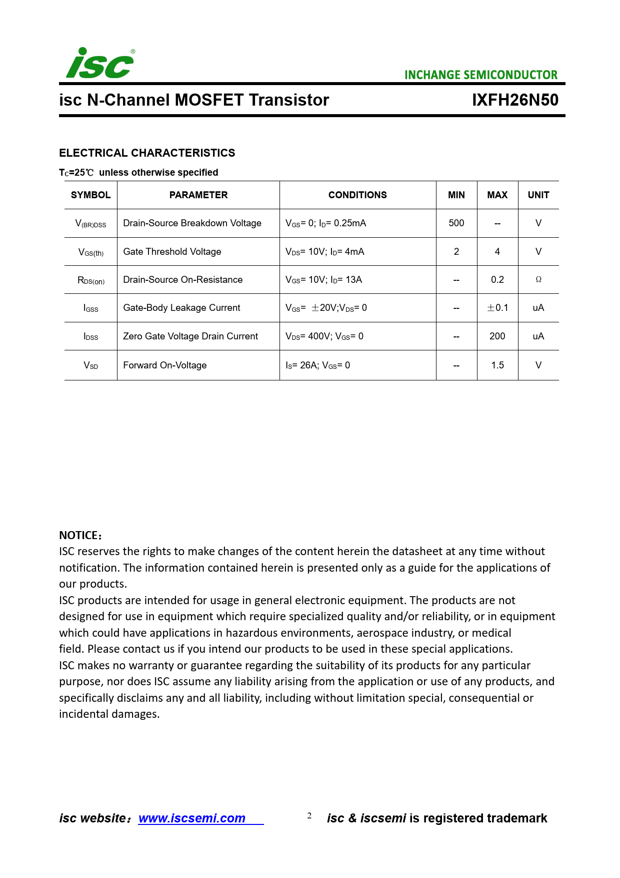 isc N-Channel MOSFET Transistor. IXFH26N50. ELECTRICAL CHARACTERISTICS TC=25. unless otherwise specified. SYMBOL. PARAMETER