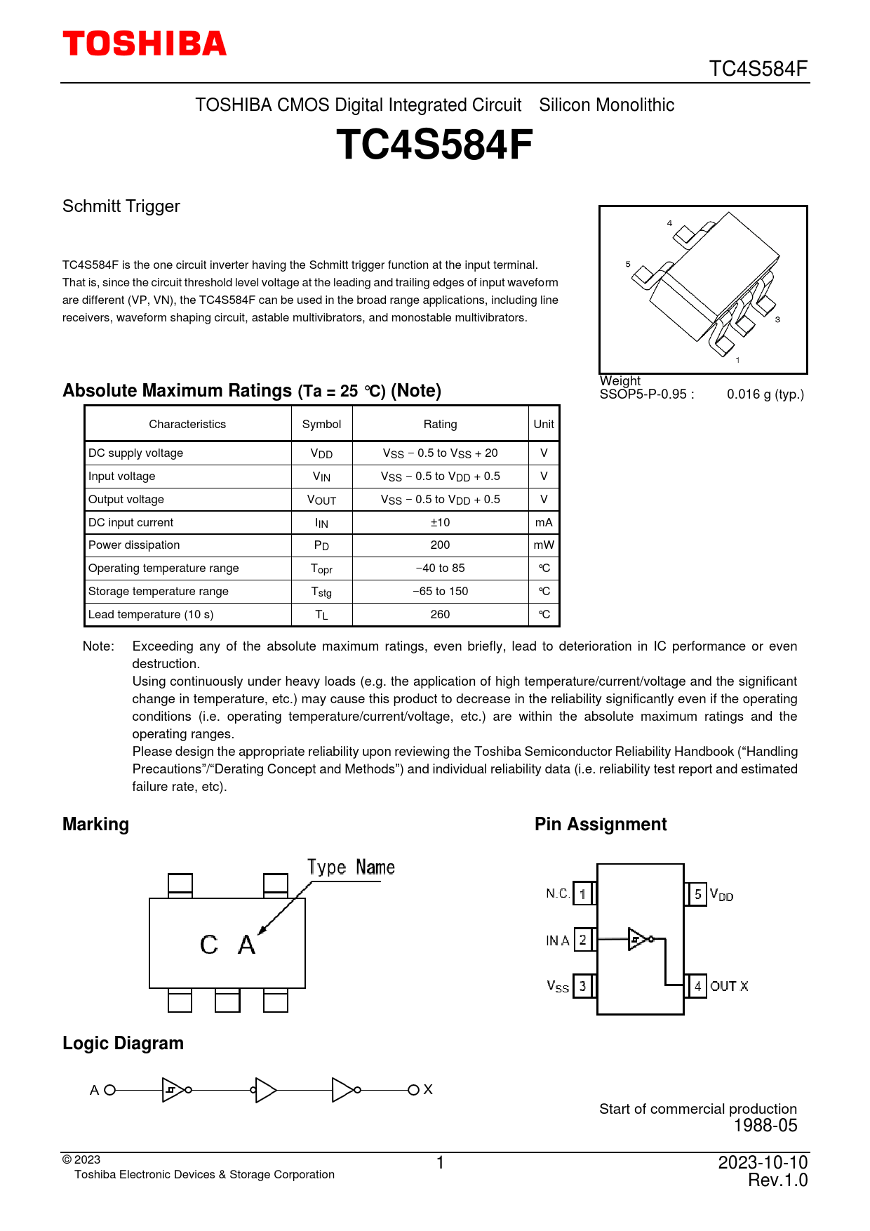 TC4S584F. Absolute Maximum Ratings. (Ta = 25 °C) (Note). Marking Pin Assignment. Logic Diagram