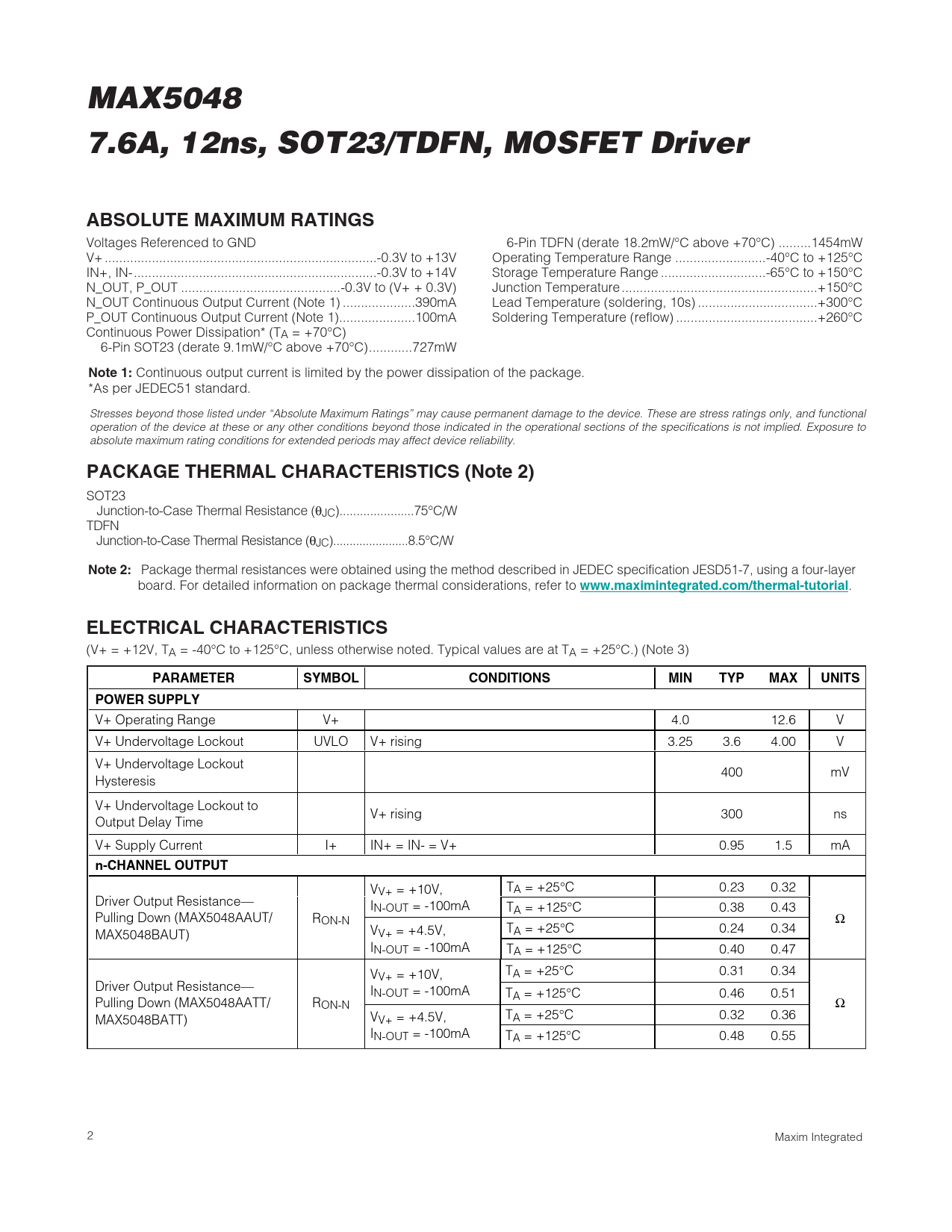 页数 / 页11 / 2 — MAX5048. 7.6A, 12ns, SOT23/TDFN, MOSFET Driver. ABSOLUTE MAXIMUM RATINGS. …