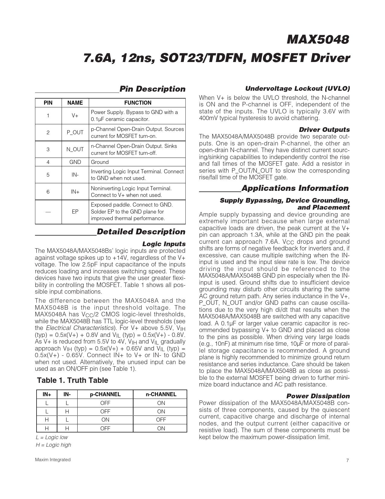 MAX5048. 7.6A, 12ns, SOT23/TDFN, MOSFET Driver. Pin Description. Undervoltage Lockout (UVLO). PIN. NAME. FUNCTION. Driver Outputs