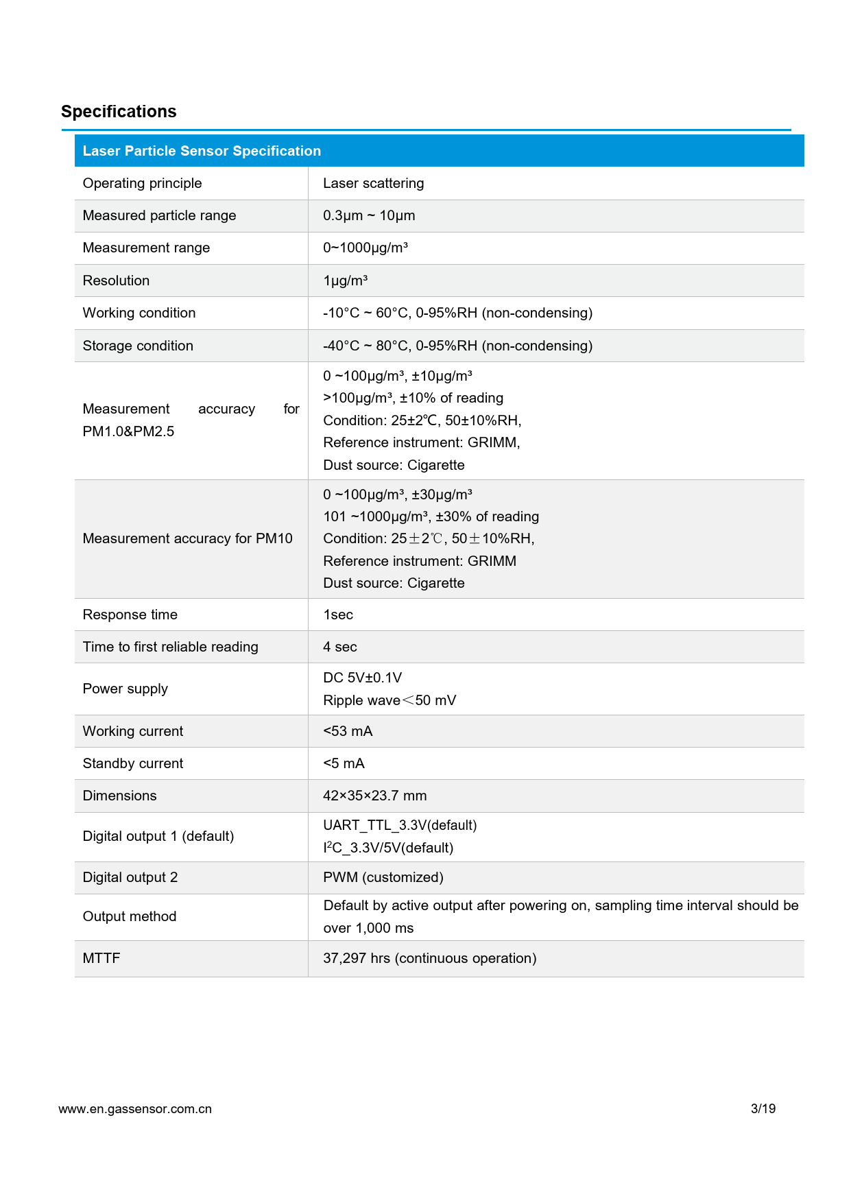 SpecificationsLaser Particle Sensor Specification Operating principle Laser scattering Measured particle range 0.3μm ~ 10μm Measurement range 0~1000μg/m³ Resolution 1μg/m³ Working condition -10°C ~ 60°C, 0-95%RH (non-condensing) Storage condition -40°C ~ 80°C, 0-95%RH (non-condensing) 0 ~100μg/m³, ±10μg/m³ >100μg/m³, ±10% of reading Measurement accuracy for Condition: 25±2℃, 50±10%RH, PM1.0&PM2.5 Reference instrument: GRIMM, Dust source: Cigarette 0 ~100μg/m³, ±30μg/m³ 101 ~1000μg/m³, ±30% of reading Measurement accuracy for PM10 Condition: 25±2℃, 50±10%RH, Reference instrument: GRIMM Dust source: Cigarette Response time 1sec Time to first reliable reading 4 sec DC 5V±0.1V Power supply Ripple wave<50 mV Working current <53 mA Standby current <5 mA Dimensions 42×35×23.7 mm UART_TTL_3.3V(default) Digital output 1 (default) I2C_3.3V/5V(default) Digital output 2 PWM (customized) Default by active output after powering on, sampling time interval should be Output method over 1,000 ms MTTF 37,297 hrs (continuous operation) www.en.gassensor.com.cn 3/19 Document Outline Description Features Working Principle Specifications Dimensions and Connector 1.Dimensions (Unit mm, tolerance ±0.2 mm) Typical Application Circuit Case 1.UART3.3V Application Product Installation User Attention UART Communication Protocol 1. General Statement 2.Format of Serial Communication Protocol 3.Command Table of Serial Protocol Note: Example: 4.3 Set up and Read Particle Calibrated Coefficien Note: Description: 4.4 Close/Open Laser Diode Note: Note: Example: Note: Example: I²C Communication Protocol 1. Brief Introduction 2. Communication Common Description 3. Protocol Detailed Description 3.1Send Command Data 3.2Read Command Data Packing Information