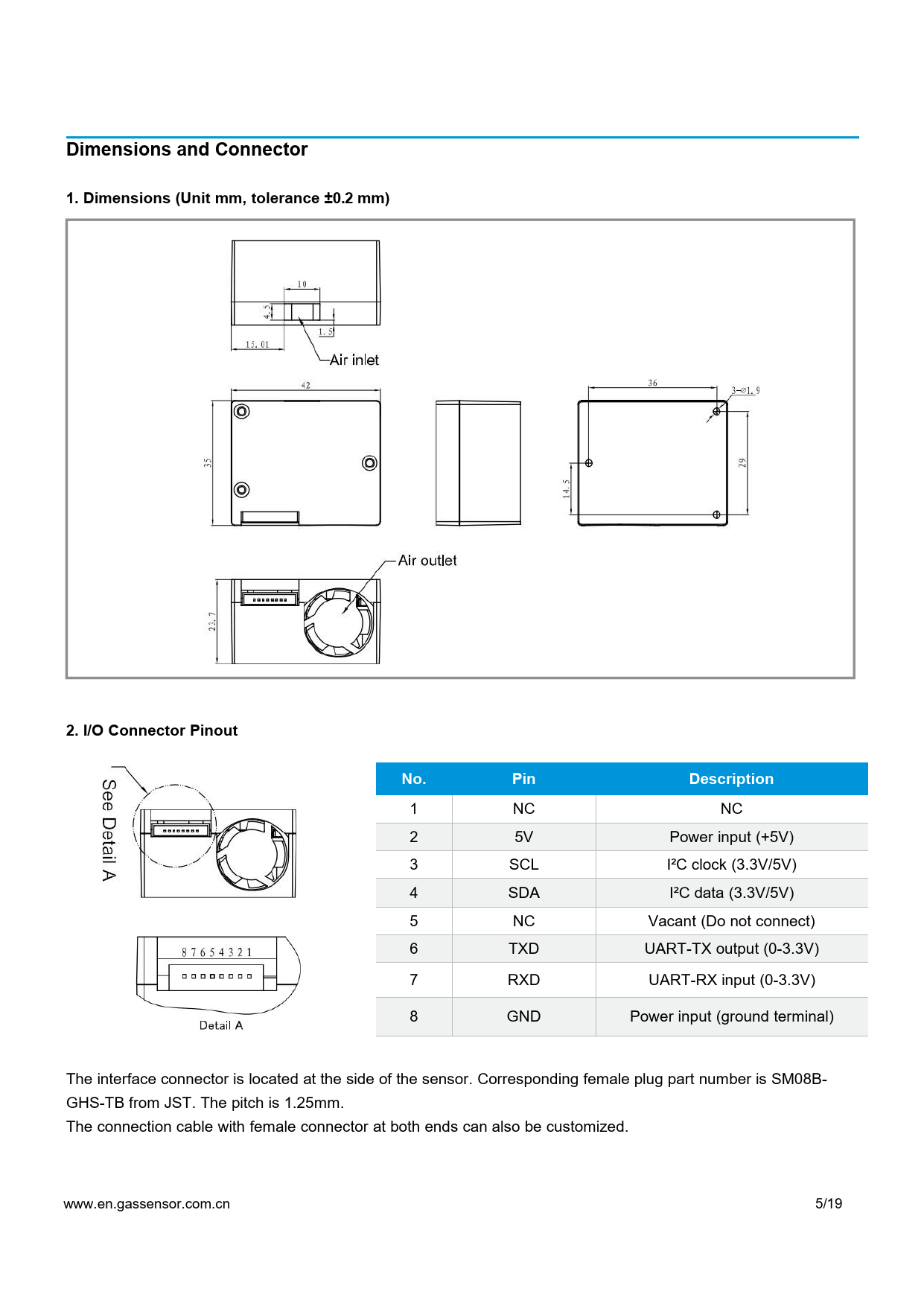 1 NC NC 2 5V Power input (+5V) 3 SCL I²C clock (3.3V/5V) 4 SDA I²C data (3.3V/5V) 5 NC Vacant (Do not connect) 6 TXD UART-TX output (0-3.3V) 7 RXD UART-RX input (0-3.3V) 8 GND Power input (ground terminal) The interface connector is located at the side of the sensor. Corresponding female plug part number is SM08B- GHS-TB from JST. The pitch is 1.25mm. The connection cable with female connector at both ends can also be customized. www.en.gassensor.com.cn 5/19 Document Outline Description Features Working Principle Specifications Dimensions and Connector 1.Dimensions (Unit mm, tolerance ±0.2 mm) Typical Application Circuit Case 1.UART3.3V Application Product Installation User Attention UART Communication Protocol 1. General Statement 2.Format of Serial Communication Protocol 3.Command Table of Serial Protocol Note: Example: 4.3 Set up and Read Particle Calibrated Coefficien Note: Description: 4.4 Close/Open Laser Diode Note: Note: Example: Note: Example: I²C Communication Protocol 1. Brief Introduction 2. Communication Common Description 3. Protocol Detailed Description 3.1Send Command Data 3.2Read Command Data Packing Information